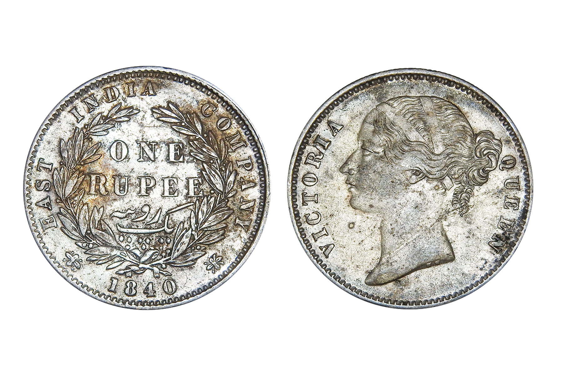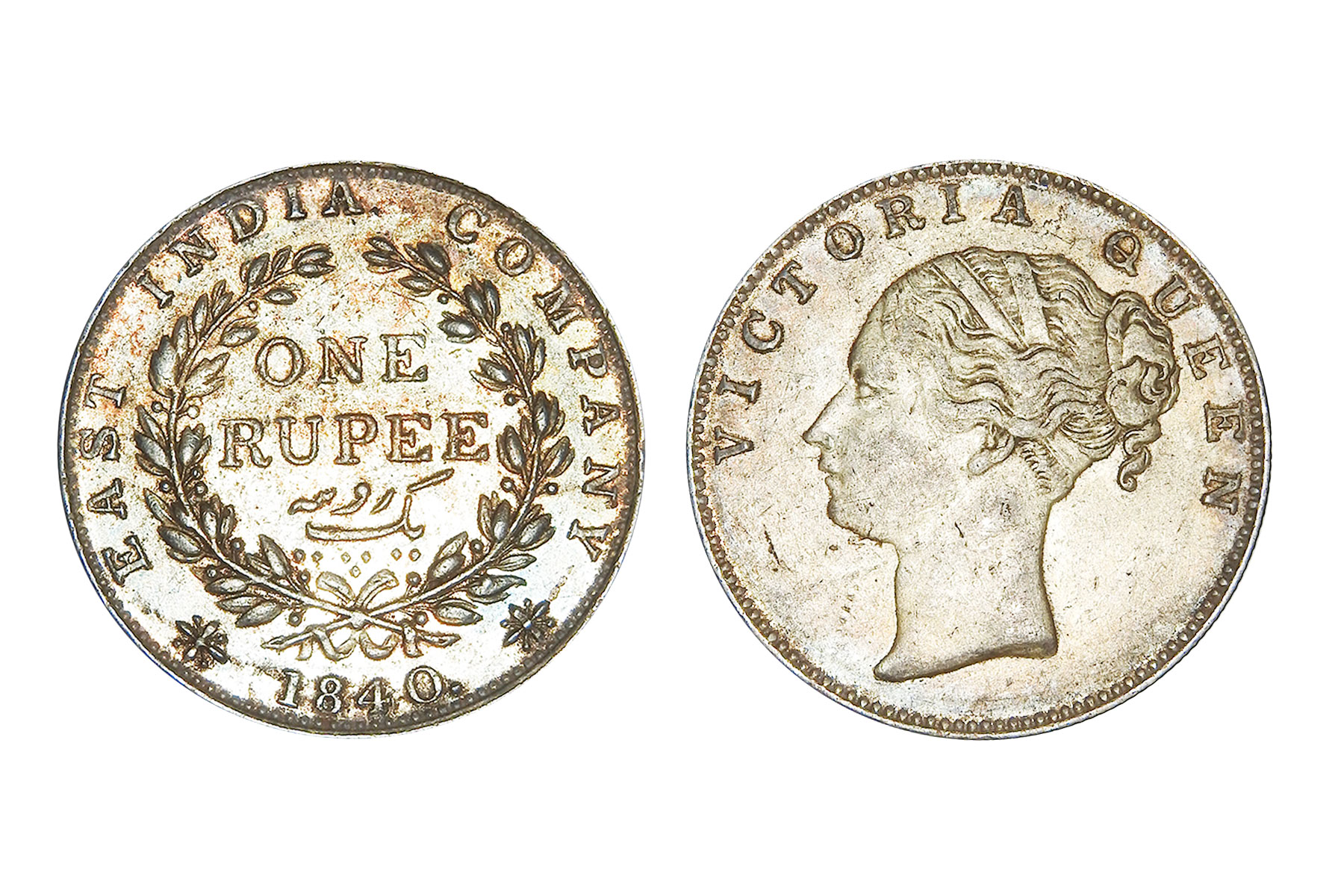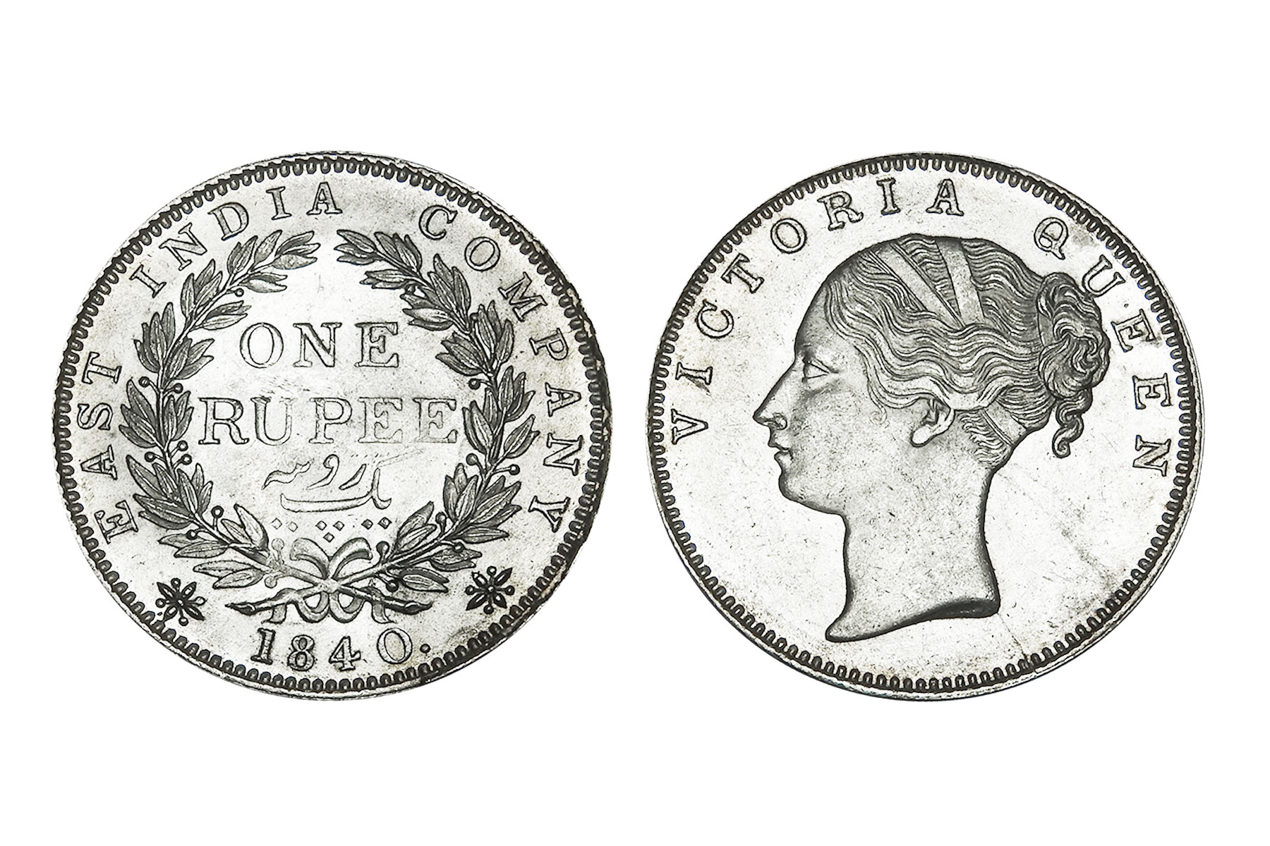 British India, William IIII, 1840 Mule, Minted in Bombay, Obv. Bust of the king, Rev. Mule of Victoria Queen. NGC Graded VF40, Very Rare. An intriguing emergency mule, this coin unites two reigns through an unusual die pairing: a William IV obverse dated 1835 combined with a reverse altered to read 1840. The reverse appears to show 40 re-punched over 35, suggesting modification of an earlier die. It was likely struck during the transitional period when new Victoria reverse dies were delayed, compelling the mint to improvise with existing William IV dies to maintain production continuity