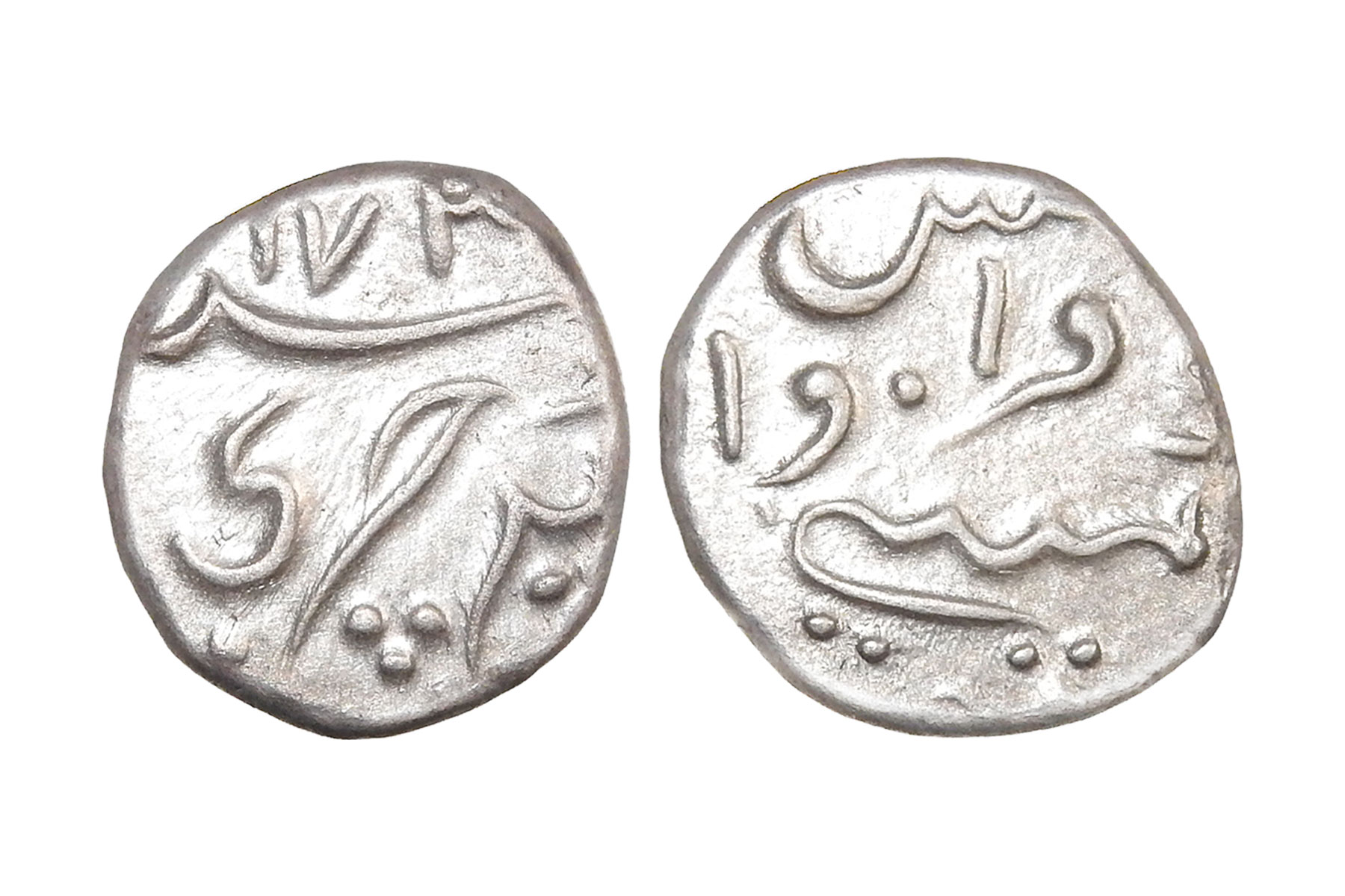 French India, Silver Fanon a.k.a 1/5th rupee, 2.30grms, Mahe Issue, AD1730, Minted at Pondicherry, without the letter "P"- Early Issue, Very Fine+