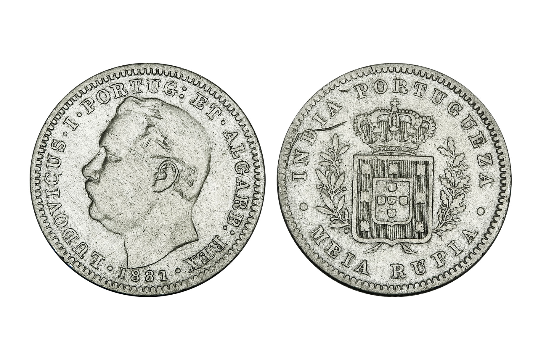 Portuguese India, Loudovic I(c. 1881CE), Silver 1/2 Meia Rupia, 5.60grms, Very Fine+.