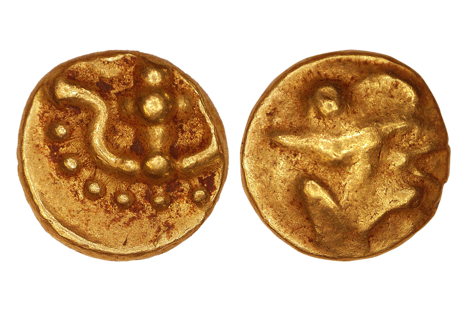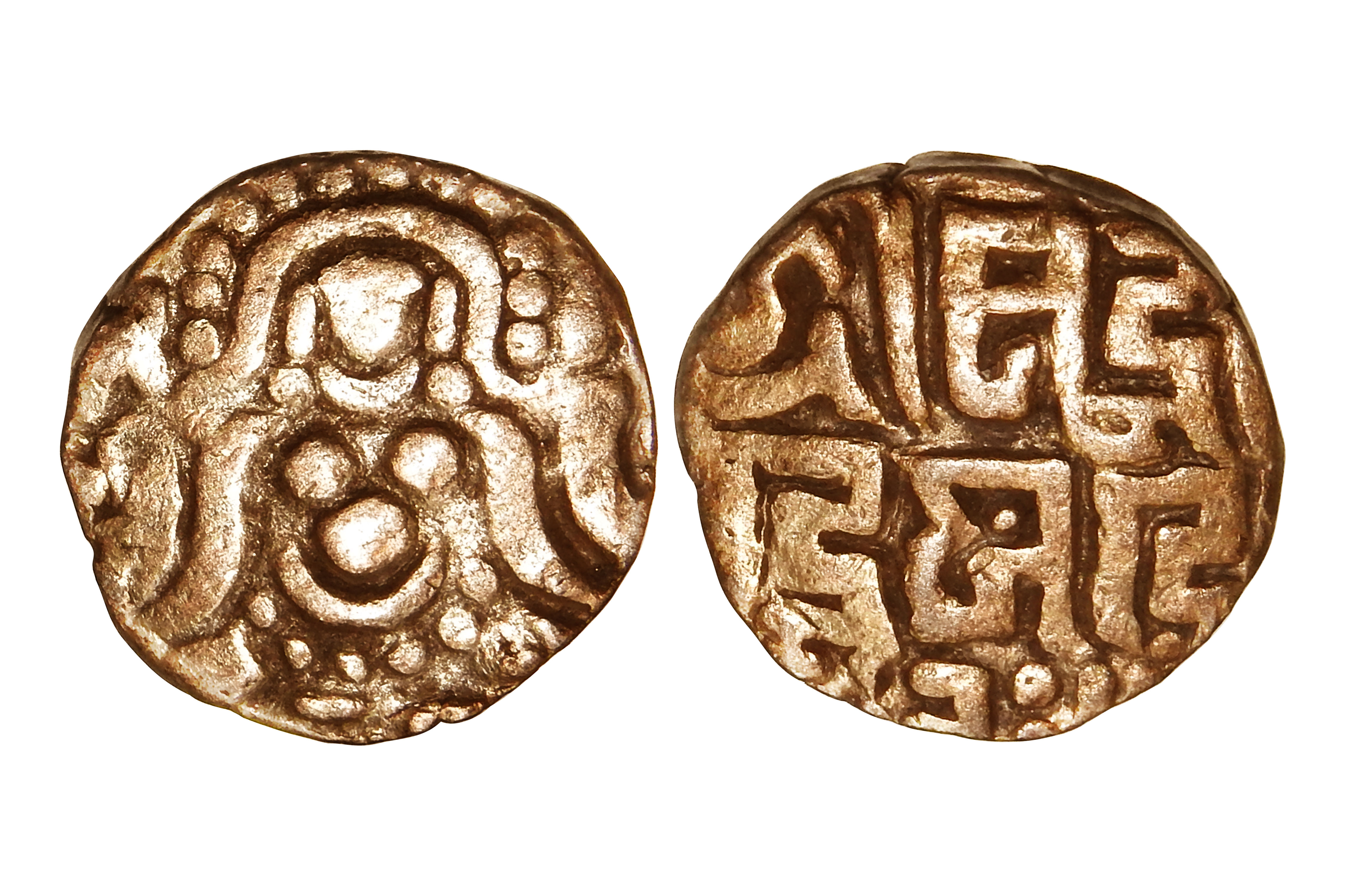 Kalachuris of Tripuri, Gangeyadeva (1015-1040 AD), Base Gold Dinar, 4 1/2 Masha, 3.80grms, obv. Seated goddess Lakshmi in pamasana with a decorated hairstyle, rev. legend in Devnagari Srimad Gangeyyadva (Deyell 119). Very Fine+, Scarce. Gangeyadeva was the most powerful Kalachuri ruler of Tripuri, aggressively expanding across central and northern India. He fought the Chandellas of Jejakabhukti, pushing into Bundelkhand, and clashed with the Paramaras of Malwa, temporarily occupying Ujjain. His campaigns brought him into conflict with the Chaulukyas (Solankis) of Gujarat and the Eastern Chalukyas. Gangeyadeva assumed the imperial title Vikramaditya, signaling supremacy after military successes, though many gains were contested and short-lived.
