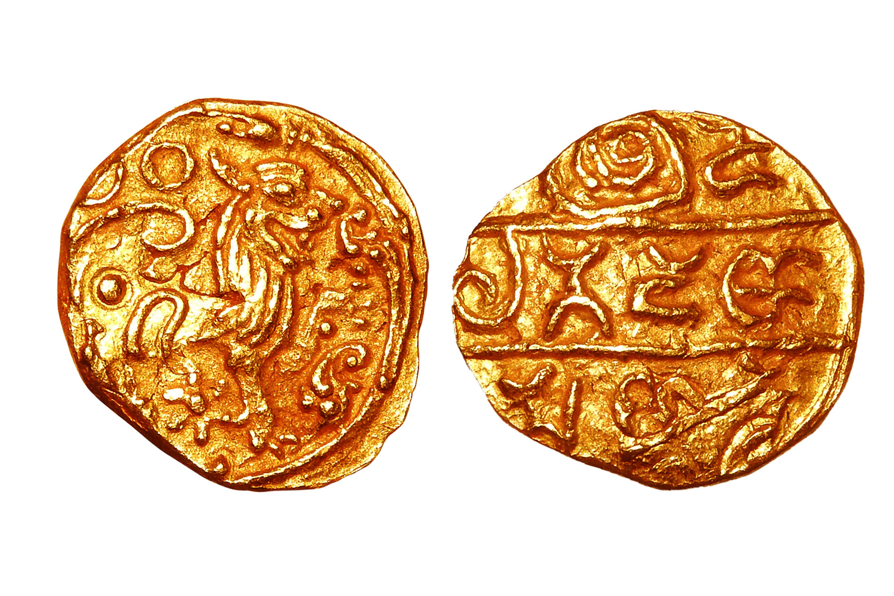 Hoysala Empire, Vishnu Vardhana (c. 1108-1152CE), Gold Pagoda, 3.90grms, Obv. A majestic lion standing to the right, foreleg raised in a poised stance, beneath the radiant Sun and Moon, all elegantly framed within an intricate floral border, Rev. Kannada legend divided in three lines Shri Maganga Konara, Overstruck on both sides on a Ganga Coin. Uncirculated, Very Rare. This remarkable gold pagoda belongs to the reign of Vishnuvardhana, one of the most celebrated rulers of the Hoysala Empire, known for territorial expansion, patronage of Vaishnavism, and the flourishing of temple architecture. The reverse legend “Shri Malagala Kesari” is extremely rare — only 3–4 specimens with this legend are known to exist. What makes this particular example especially significant is that it is overstruck on both sides over a Ganga coin, a feature not seen in any other recorded specimen. Such overstriking provides a unique insight into the transitional monetary practices of early 12th-century Karnataka and the interactions between the Hoysalas and their predecessors. This coin is therefore not only a numismatic rarity but also a critical historical artifact, offering valuable evidence for scholars studying coinage succession, dynastic authority, and the evolution of royal titulature in the Hoysala period.