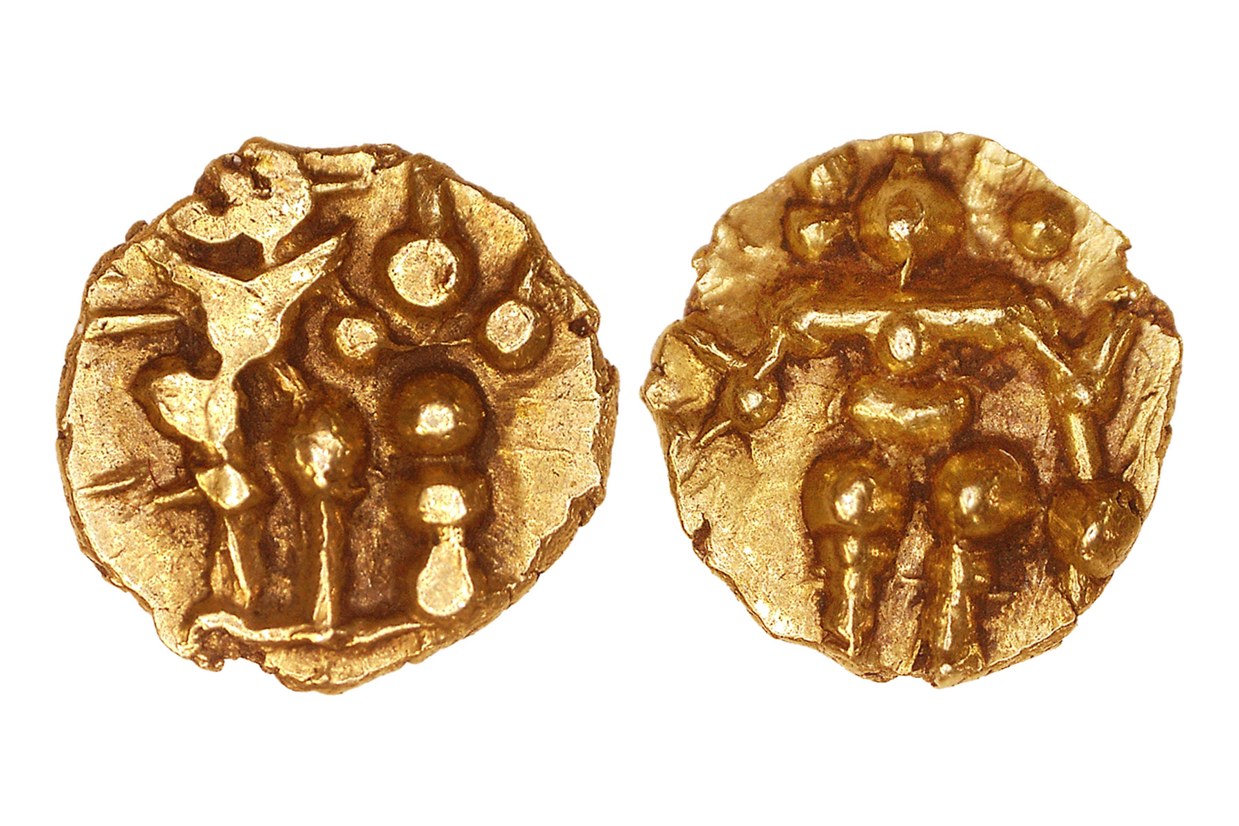 Hoysala Dynasty, Veera Ballala II, (c. 1173-1220CE), Gold Gadyana, 3.80grms, 9 Punches, 5x Nandi Bull Facing right with Sun & Moon on Back, 2x Shri, 1x Kannada legend Vi Ra, 1x Kannada legend Ba La, bold and deep punches, Exceptional Quality, First recorded specimen- Nolamba Style, Exceedengly Rare and Historically important. A remarkable and previously unrecorded coin bearing the legend “Ve Ra- Ba-La” appears to represent an early issue of Veera Ballala II, struck upon the traditional Nolamba fabric following the Hoysala conquest of Nolambavadi in the late 12th century. The type closely mirrors established Nolamba prototypes in module and style, suggesting a transitional issue produced immediately after Hoysala military absorption of the region. Rather than introducing a new design, Ballala may have retained the familiar local format while asserting authority through the abbreviated royal legend. The coin stands as tangible evidence of political transition — a rare numismatic bridge between Nolamba regional rule and emerging Hoysala imperial control. A historically compelling and potentially groundbreaking attribution. Veera Ballala II greatly expanded the Hoysala Empire, pushing its northern frontier up to the Tungabhadra and Krishna rivers. In Hoysala records dating around 1196 CE, Ballala II claims to have been victorious over several regional powers, including the Nolambavadi territory — the traditional lands of the Nolamba dynasty — along with Banavasi, Hangal, Halashi, Bagalkot, and Yelburga. This indicates that the Hoysalas had militarily asserted control over Nolambavadi, effectively bringing former Nolamba domains into Hoysala dominion during his conquests. Archaeological evidence further supports this transition: a Hoysala inscription of Veera Ballala II found at Hemavati (ancient Henjeru), the former capital of the Nolamba Pallavas, records royal donations to a temple there in 1206 CE, suggesting not just conquest but also administrative and religious influence in the region following its incorporation. In short, Ballala II’s military expansion absorbed Nolambavadi into the Hoysala realm, and epigraphic records show he exercised authority there after conquest.