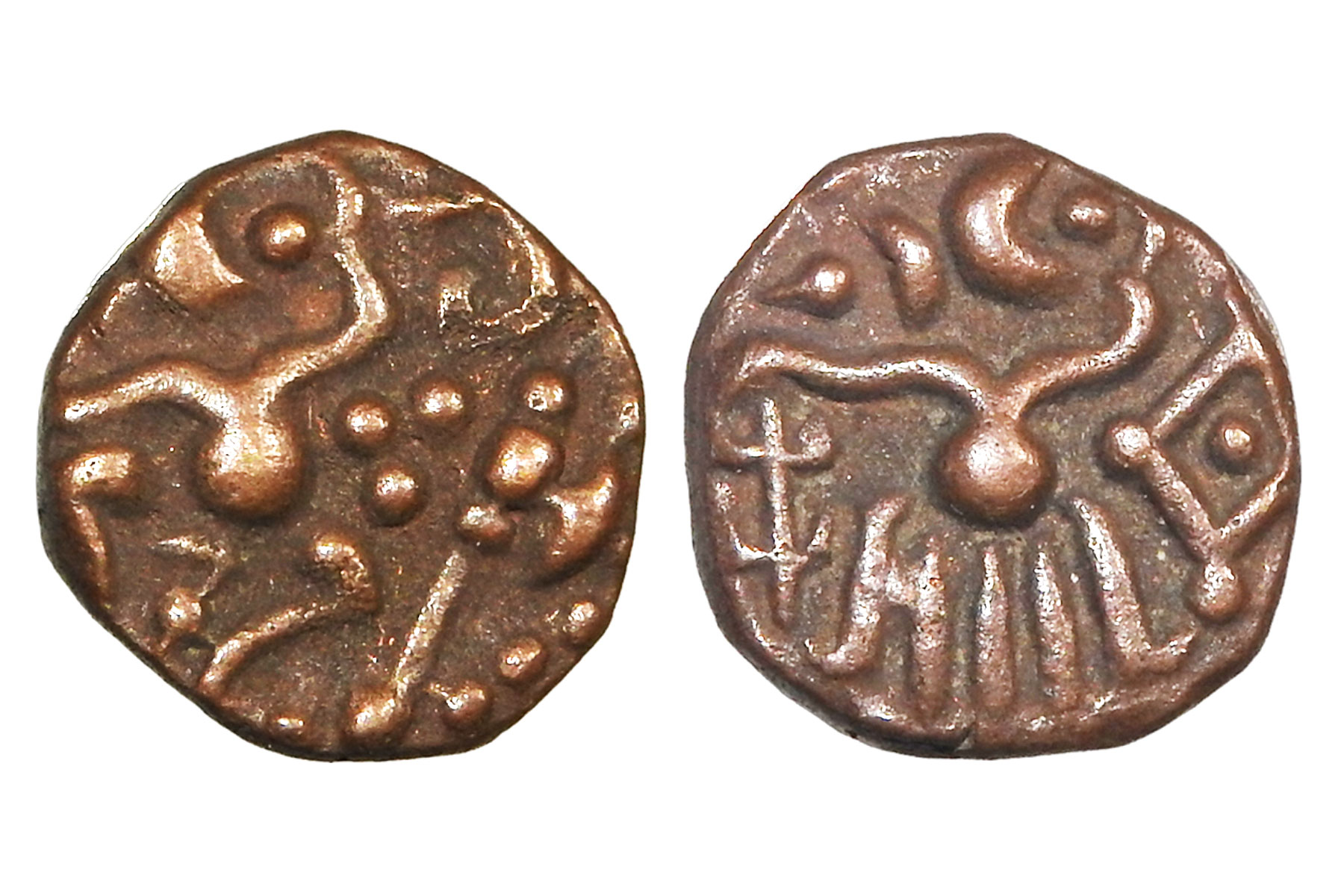 Pallavas of Sendamangalam (1221-1278 AD), Copper Kasu, 3.3g, obv. bull standing facing right, a crescent above and conch in the front, possible kannada legend "BA" above the back, Rev. Chola style king standing (Mitch 355). Very Fine, Rare. Pallavas of Sendamangalam were a late Pallava (Kadava Pallava) branch who ruled parts of northern Tamil Nadu, engaging in repeated conflicts with the Cholas, Hoysalas, and emerging Pandya power, before being finally absorbed as Pandya dominance expanded