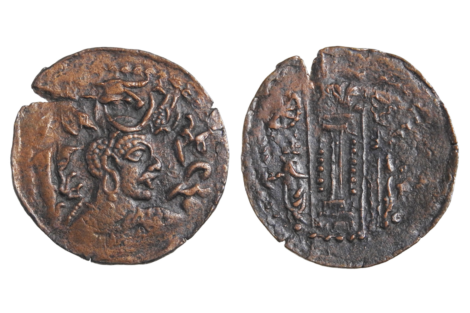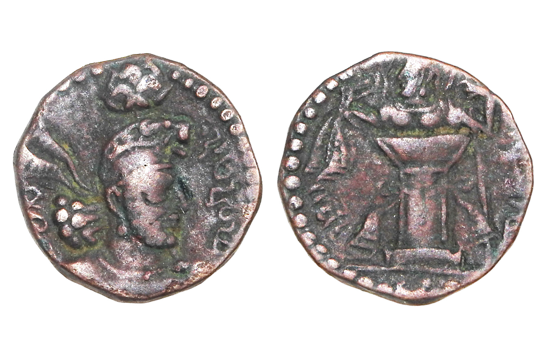 Kushano-Sasanian Kingdom, Hormizd I, Copper Unit, 2.20grms, Deity on Altar Type, Obv: Bust, lion-head crown with pahlavi legend on right, Rev: Head and flamed shoulders of male deity arising from decorated altar, sceptre in his left, beribboned wreath in right; the Pahlevi legend translates 'the exalted god', Pieper#1956 Extra Fine+, Very Scarce Hormizd I was a Kushano-Sasanian ruler who exercised firm military and administrative control over Bactria, Gandhara, Kabulistan, and adjoining north-western Indian border regions. He suppressed residual Kushan authority, secured volatile frontier zones, and enforced Sasanian supremacy. His reign strengthened imperial control over strategically vital eastern territories through decisive leadership and regional governance
