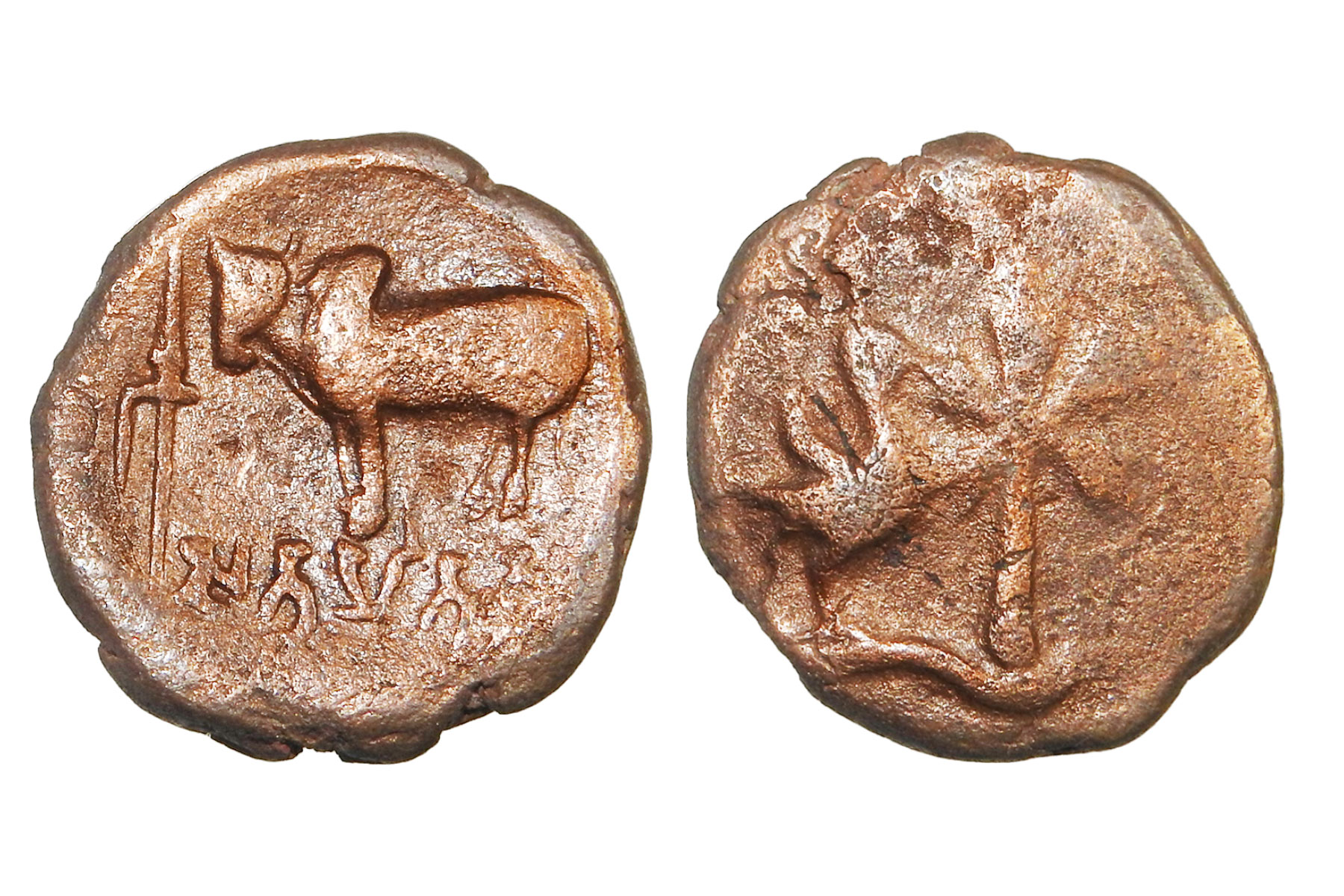 Ayodhiya City State, Satyamitra, (c. 250-300CE), Copper Unit, Obv: Bull to left, facing sacrifical post and Brāhmī legend satyamitrasa, Rev: Peacock to right with palm-tree on right, Pieper#1062, One of the best specimens to surface, Extra Fine condition, Very Rare Ruler.Ayodhya functioned as an independent city-state during the post-Mauryan period, navigating a landscape dominated by warfare and shifting regional powers. Satyamitra, its ruler, emerged as an assertive king who defended Ayodhya against external pressures from expanding dynasties such as the Shungas and rival local chiefs. His reign required active military engagement to protect territory and strategic alliances to counter imperial ambitions. Rather than remaining isolated, Satyamitra positioned Ayodhya as a resilient political and military actor, demonstrating how ancient urban centres survived through conflict, diplomacy, and calculated resistance in a fragmented north Indian world.