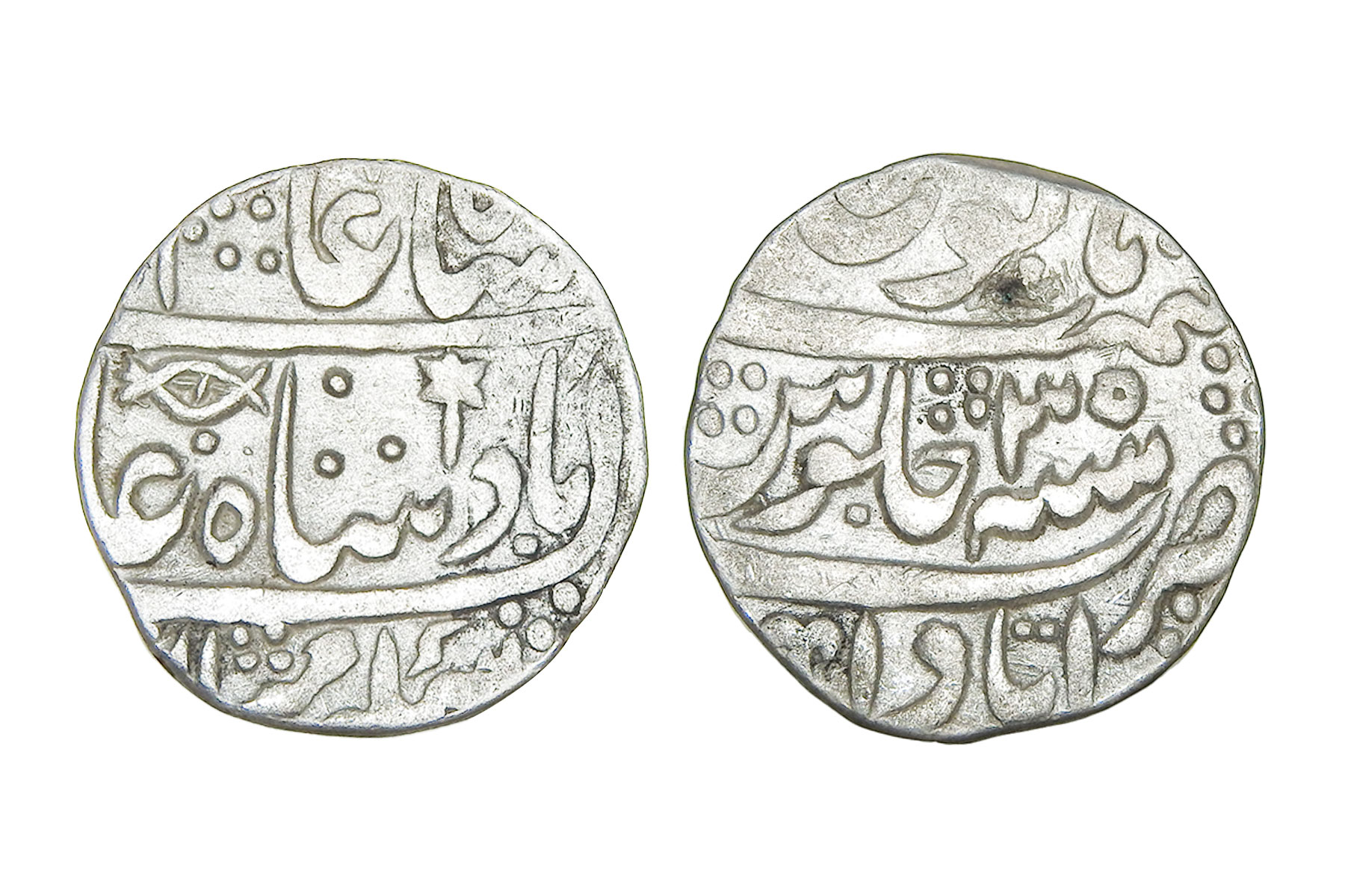 Awadh Nawabs, Asaf-ud-Daula (c. 1775–1797CE), Silver Rupee, 11.10grms, RY33, Issued in the name of Mughal King- Shah Alam II, Minted as Itawa, crude Fish and Katar as mintmark, Large Nazarana style Flan with bold legend and deep strike, Extra Fine+, Rare