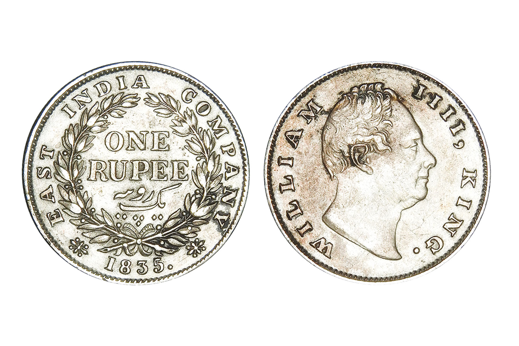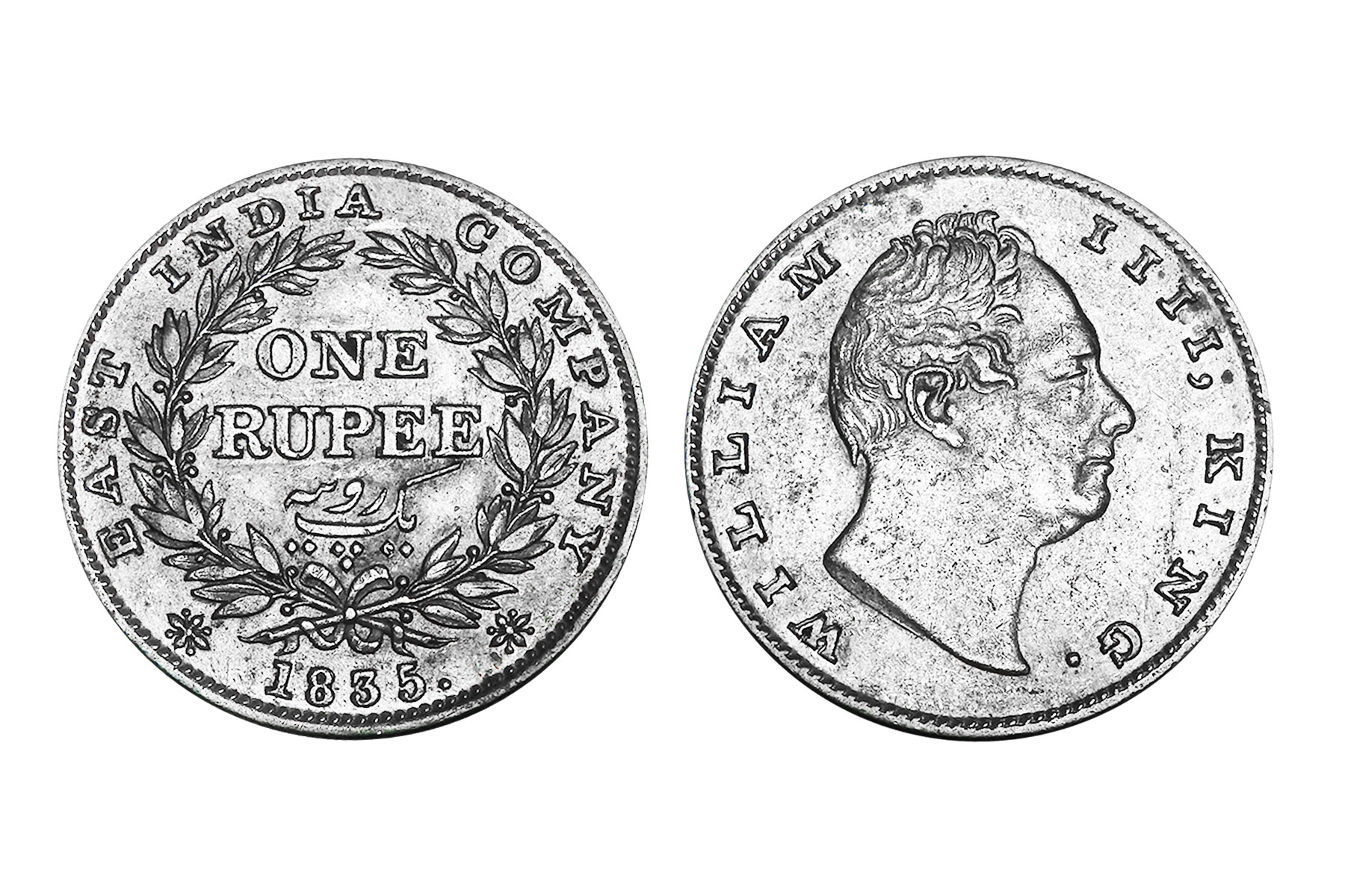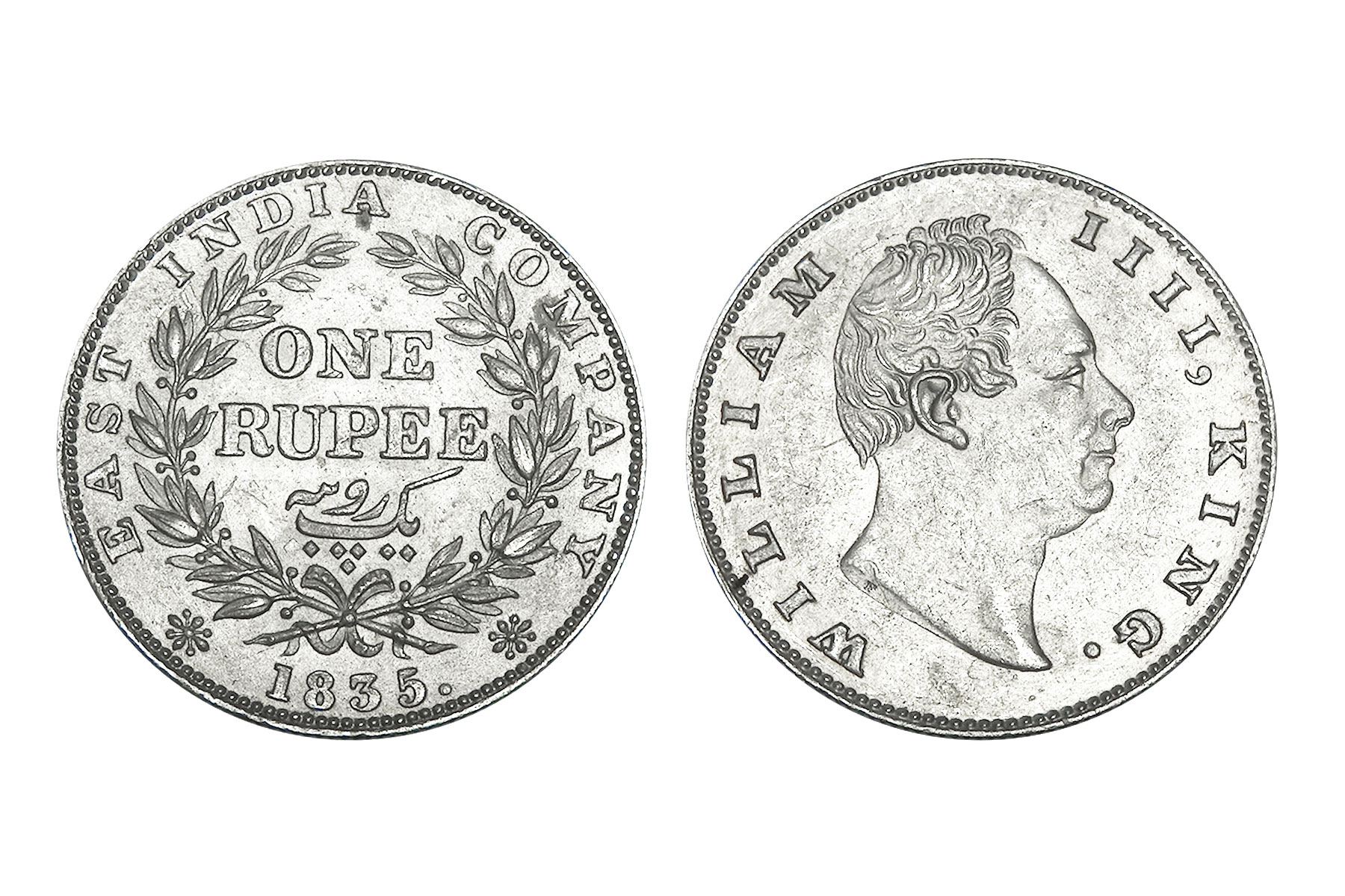 British India, William IIII, 1840 Mule, Minted in Bombay, Obv. Bust of the king, Rev. Mule of Victoria Queen. NGC Graded VF40, Very Rare. An intriguing emergency mule, this coin unites two reigns through an unusual die pairing: a William IV obverse dated 1835 combined with a reverse altered to read 1840. The reverse appears to show 40 re-punched over 35, suggesting modification of an earlier die. It was likely struck during the transitional period when new Victoria reverse dies were delayed, compelling the mint to improvise with existing William IV dies to maintain production continuity