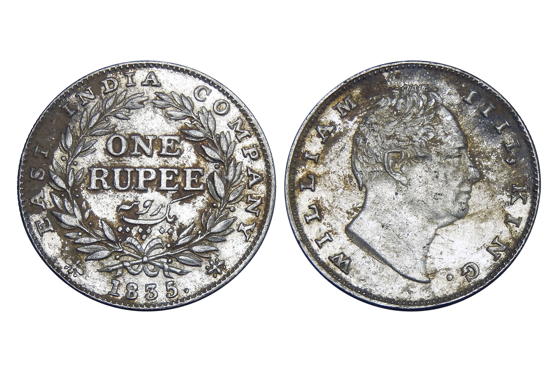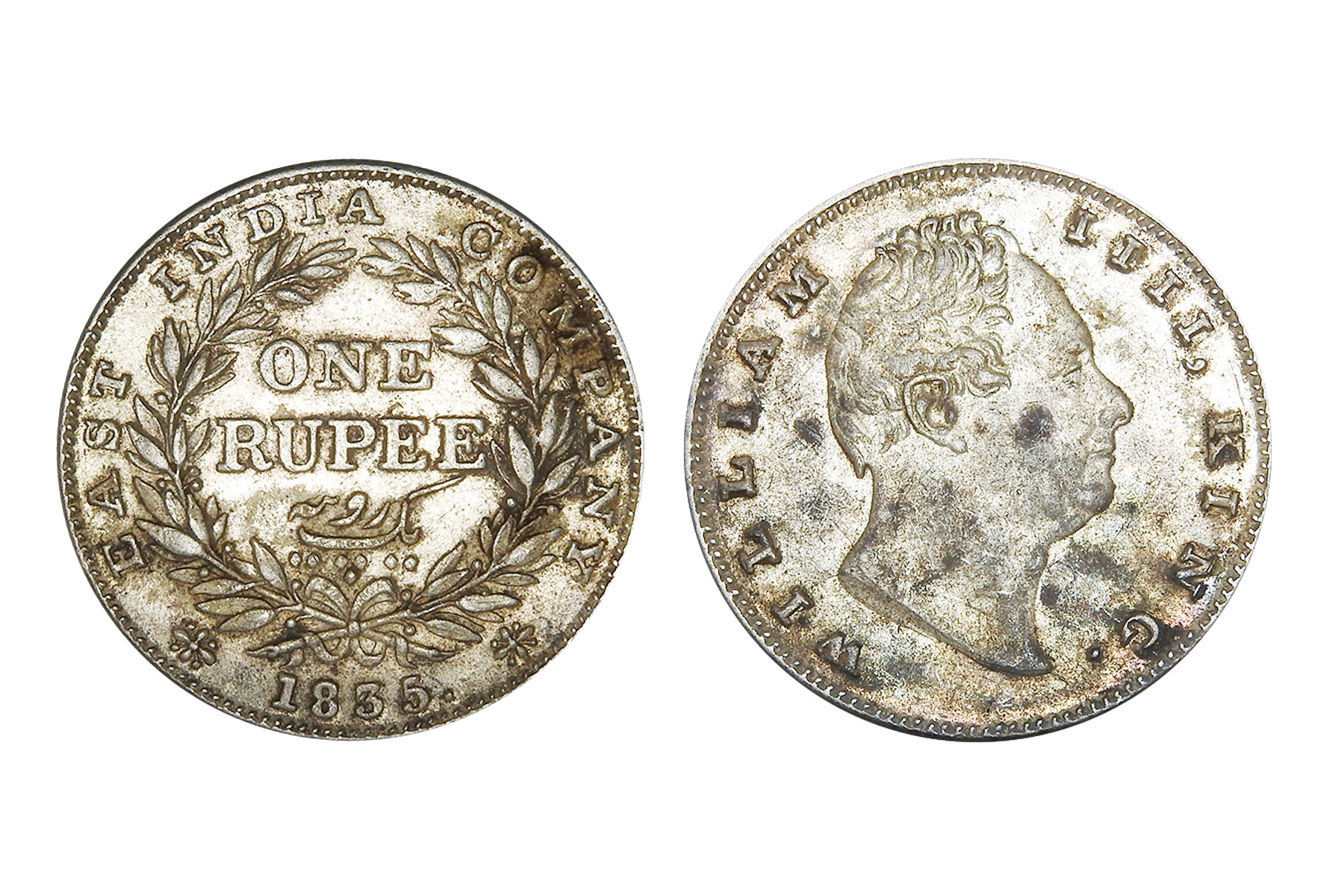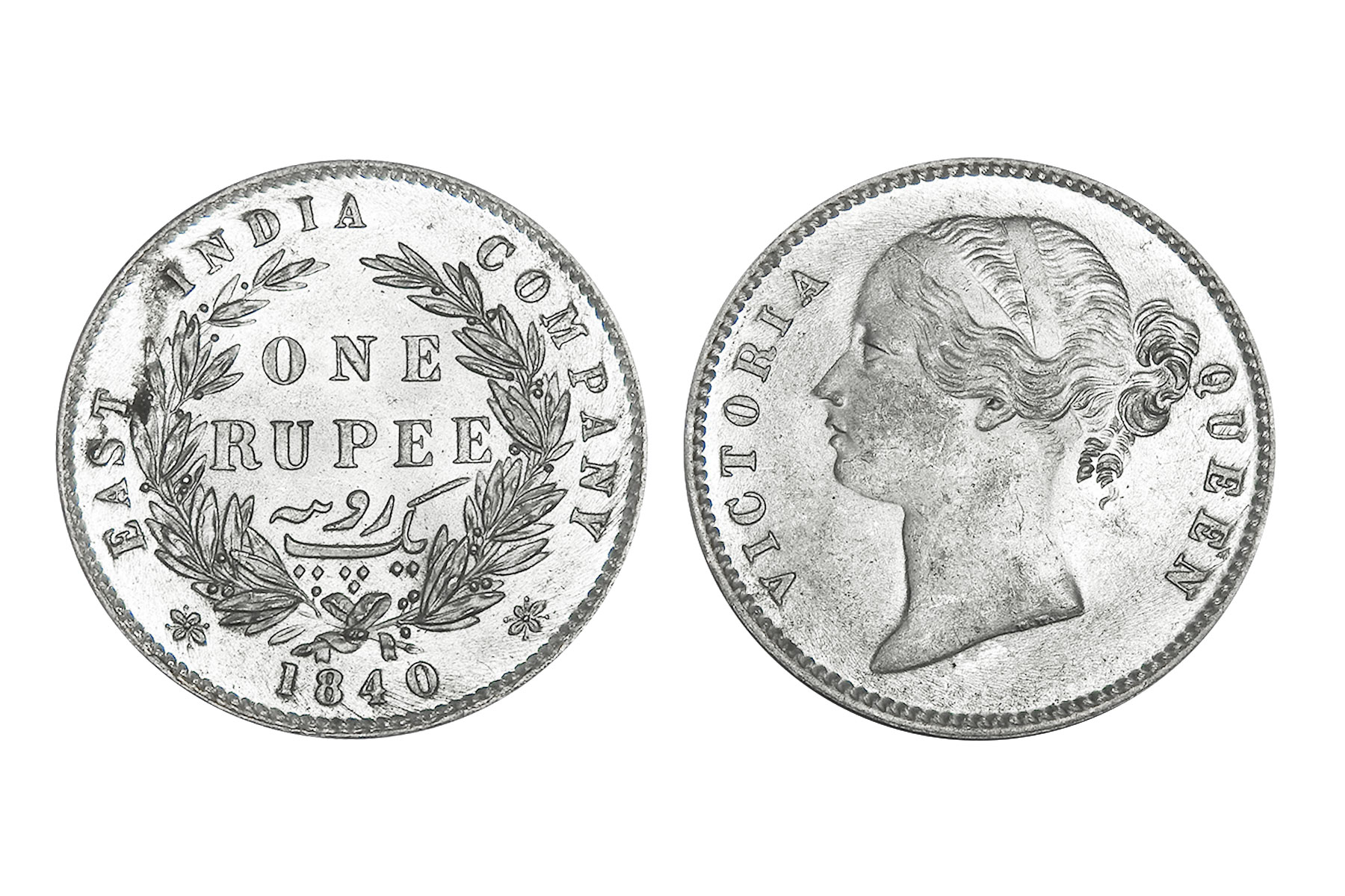 British India, William IIII, 1840 Mule, Minted in Bombay, Obv. Bust of the king, Rev. Mule of Victoria Queen. NGC Graded VF40, Very Rare. An intriguing emergency mule, this coin unites two reigns through an unusual die pairing: a William IV obverse dated 1835 combined with a reverse altered to read 1840. The reverse appears to show 40 re-punched over 35, suggesting modification of an earlier die. It was likely struck during the transitional period when new Victoria reverse dies were delayed, compelling the mint to improvise with existing William IV dies to maintain production continuity