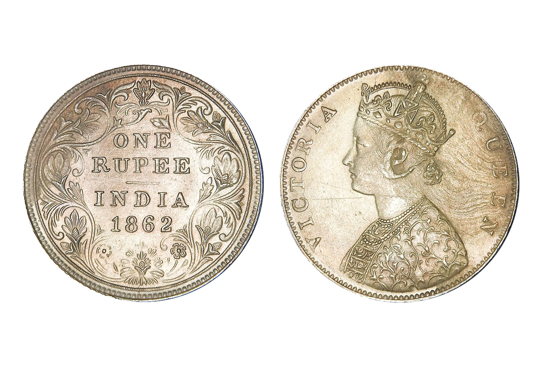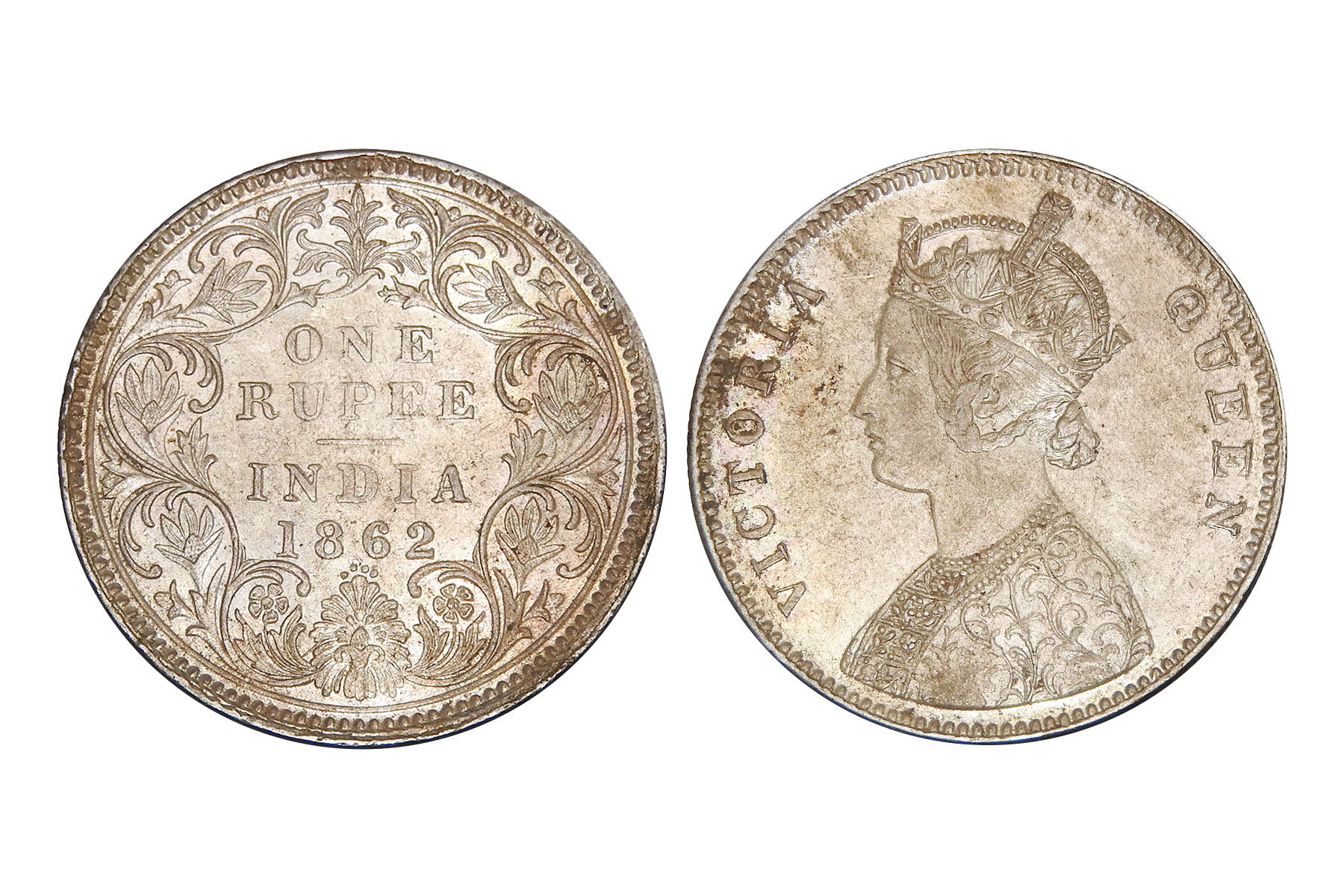 British India, Victoria Queen, Silver Rupee, 11.66grms, 1862, GK#300, B/II/0/3, without "J", Re-Engraved embroidery on the bust, Minted at Bombay, Extra Fine, Very Scarce