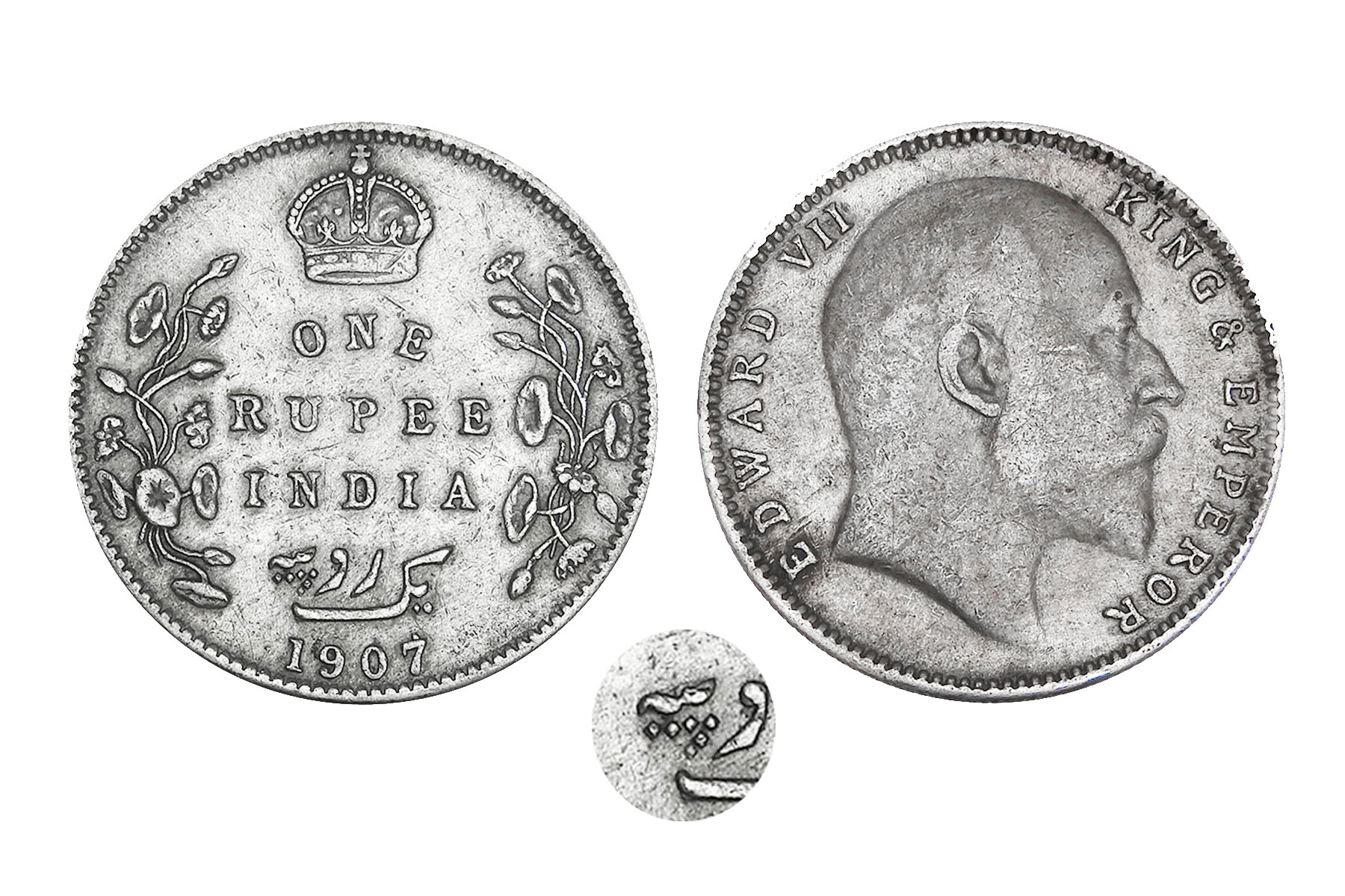British India, Edward VII, Silver Rupee, 11.66grms, 1907, 6 diamonds in Urdu inscription, GK Unlisted, Dot on stem as mintmark, Minted at Bombay, First Known specimen in this verity, Extra Fine, Exceedingly Rare