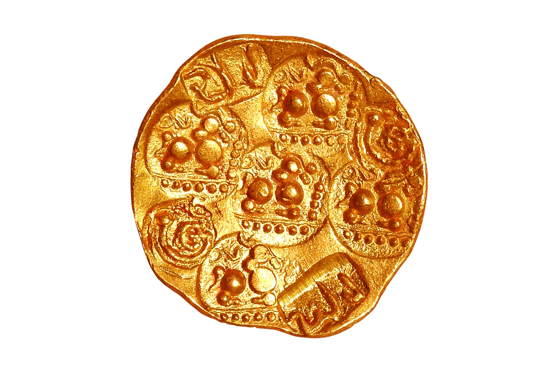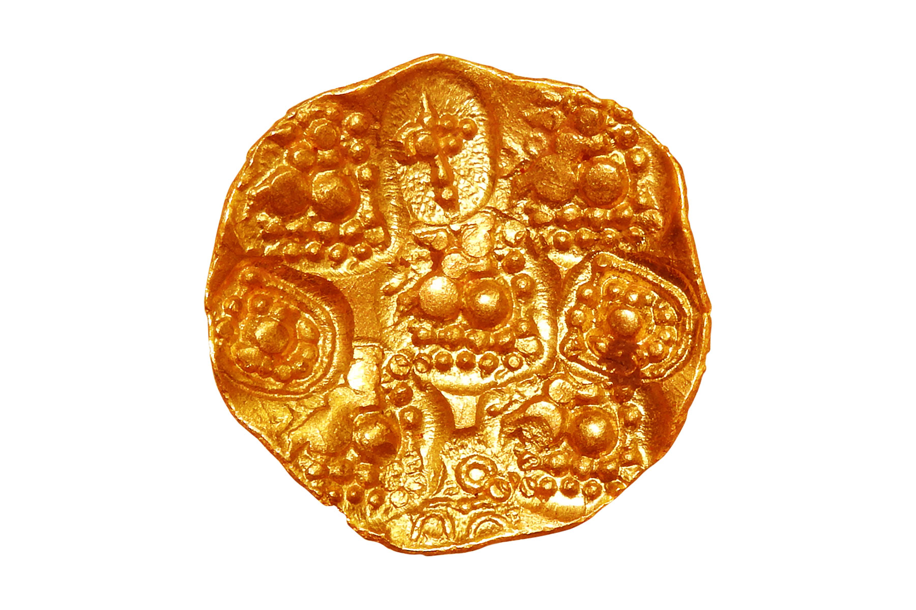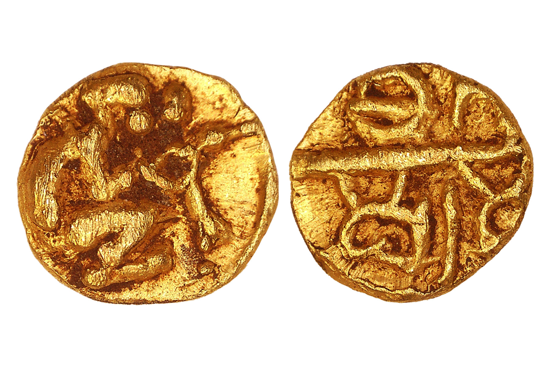 Hoysala Empire, Vishnu Vardhana (c. 1108-1152CE), Gold Pagoda, 3.90grms, Obv. A majestic lion standing to the right, foreleg raised in a poised stance, beneath the radiant Sun and Moon, all elegantly framed within an intricate floral border, Rev. Kannada legend divided in three lines Shri Maganga Konara, Overstruck on both sides on a Ganga Coin. Uncirculated, Very Rare. This remarkable gold pagoda belongs to the reign of Vishnuvardhana, one of the most celebrated rulers of the Hoysala Empire, known for territorial expansion, patronage of Vaishnavism, and the flourishing of temple architecture. The reverse legend “Shri Malagala Kesari” is extremely rare — only 3–4 specimens with this legend are known to exist. What makes this particular example especially significant is that it is overstruck on both sides over a Ganga coin, a feature not seen in any other recorded specimen. Such overstriking provides a unique insight into the transitional monetary practices of early 12th-century Karnataka and the interactions between the Hoysalas and their predecessors. This coin is therefore not only a numismatic rarity but also a critical historical artifact, offering valuable evidence for scholars studying coinage succession, dynastic authority, and the evolution of royal titulature in the Hoysala period.