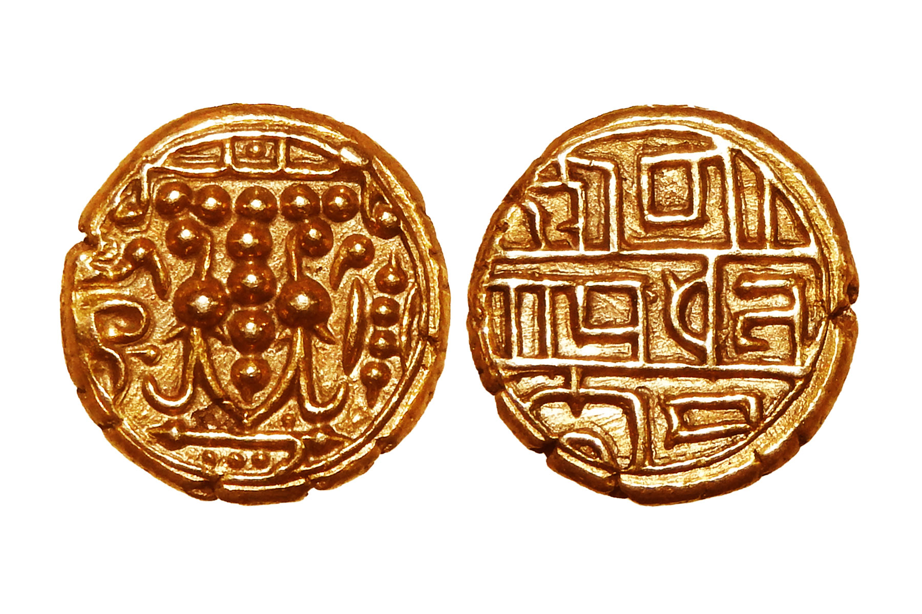 Alupas of Udupi, Kulaśékhara-II(c. 1321-1346), Gold Gadyana, 3.60grms, Obv. Royal Emblem-Mīna Lanchana comprising two highly stylized vertical fishes, positioned above the elephant goad (Ankuśa) and beneath the royal Umbrella. A stylized Conch (Śaṅkha) appears to the left, with a serpent-coiled Hand-Drum (Damaru) to the right. The entire design is enclosed within a circular border, Rev. Legend “Śrī Pā/ndya Dhanam/jaya” in 14th-century squarish Nāgari script, arranged in separated lines. Enclosed within a circular border, Prabhu#52, About Uncirculated, Base Gold issue, Very Rare The Alupa dynasty ruled the coastal Tulunadu region, including modern Udupi, from the 3rd to the 14th century CE, often balancing independence with vassalage under the Kadambas, Chalukyas, and Pandyas. Kulaśékhara II, a late 14th-century ruler, governed during the dynasty’s twilight, consolidating authority over Udupi while navigating pressures from stronger neighbors. His reign reflects the final assertion of Alupa sovereignty, marked by strategic diplomacy, regional administration, and patronage of temples and religious institutions. Under Kulaśékhara II, the dynasty maintained local identity and cultural prominence until eventual absorption into larger powers such as the Vijayanagara Empire.