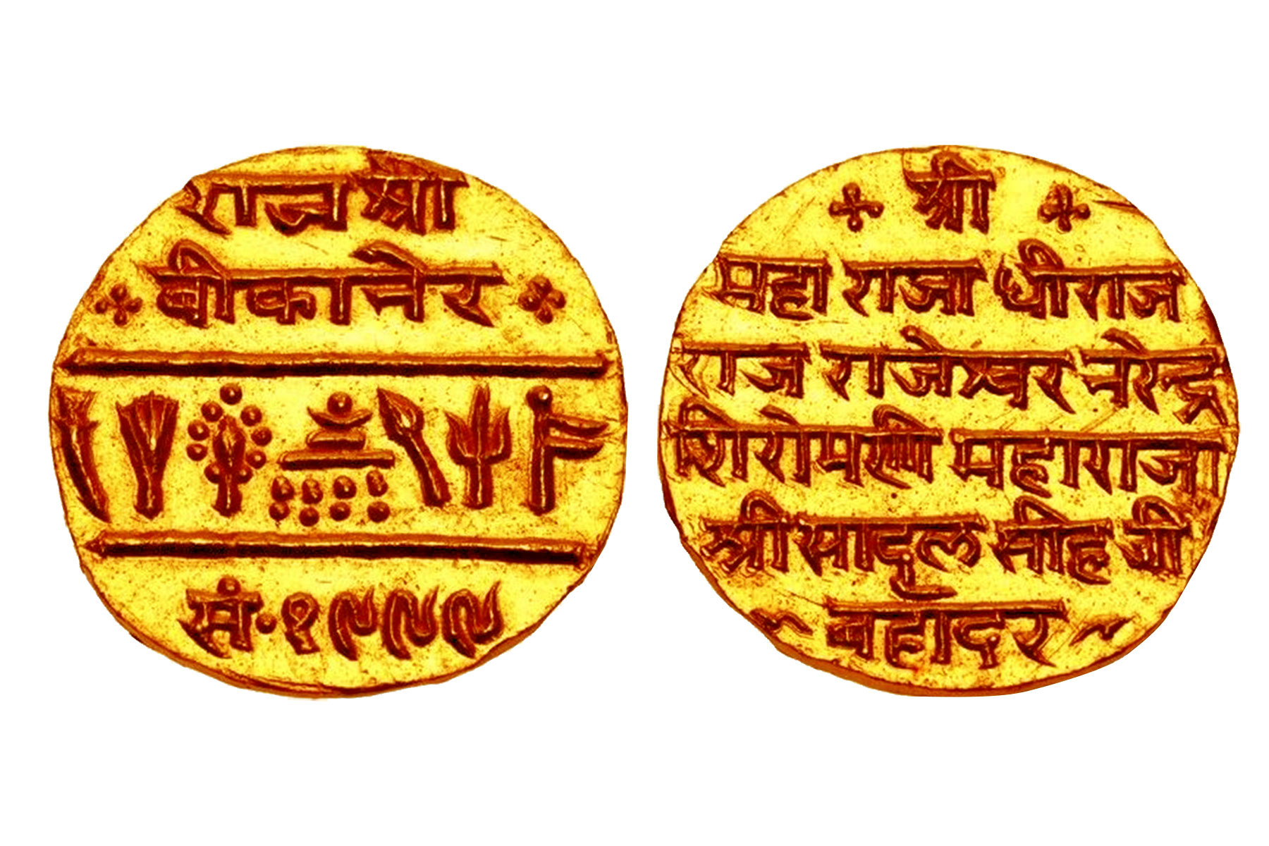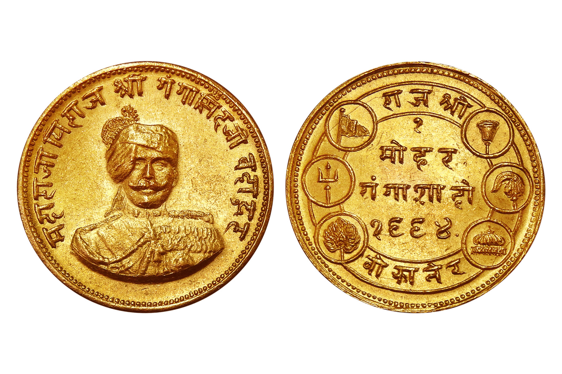 Bikaner State, Sadul Singh(c. 1943-1949CE), Gold Presentation Mohur, 8.70grms, VS1999/AD1942, Obv. Devanagari Script श्री महा राजा धीराज राज राजेश्वर नरेन्द्रे शिरोमणि महाराज श्री सादुल सीह जी बहादुर ( Sri / Maha Raja Dhiraj / Raj Rajeshwar Narendra / Shiromani Maharaj / Sri Sadul Singh Ji / Brave), Rev. Devanagari Script राजाश्री बीकानेर सं·१९९९ (Raja Shri Bikaner 1999) with Seven Auspicious Symbols Signifying Royal Authority such as trishul, parasol, flag, temple top and Sword, Mint State and Exceedingly Rare. Sadul Singh ascended the throne of Bikaner during the closing phase of British paramountcy and the turbulent years surrounding Indian independence. Educated and politically aware, he played a measured and diplomatic role in navigating his state through constitutional transition, ultimately acceding to the Indian Union while safeguarding Bikaner’s dignity and legacy. His reign, though brief, represents the final chapter of sovereign Rajput authority in the region, making issues struck in his name historically poignant as symbols of both continuity and closure. Only four examples of this prestigious gold issue have appeared in the marketplace to date. Of those, two bore signs of prior mounting, and the most recent public offering occurred nearly a decade ago. The present piece stands apart in preservation and visual integrity, representing the finest quality among all recorded specimens. Its superior state elevates it beyond mere rarity into the realm of true condition census significance. Opportunities to acquire a specimen of this calibre are exceptionally infrequent, positioning this offering as a landmark chance for the discerning collector to secure the definitive example of this remarkable late-princely gold issue.