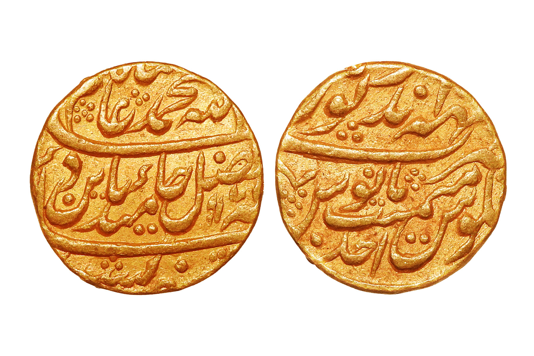Bharatpur State, Maharaja Suraj Mal(c. 1755–1763CE), Gold Mohur, 10.90grms, Issued in the name of Mughal King- Shah Alam II, AH1173/RY AHAD, Minted at Mahaindrapur, Uncirculated and pleasing coin, Very Rare. Maharaja Suraj Mal was one of the most capable rulers of the Jat kingdom. He consolidated fragmented territories, fortified Bharatpur with strong defenses, and expanded his influence across northern India. Renowned for his military acumen, Suraj Mal successfully defended his state against both Mughal forces and Maratha incursions, skillfully using alliances and strategic diplomacy. Beyond warfare, he promoted agriculture, civic infrastructure, and temple construction, leaving a lasting mark on the region’s prosperity and culture. His reign is remembered for strength, effective governance, and architectural achievements, making him a towering figure in 18th-century Rajasthan.