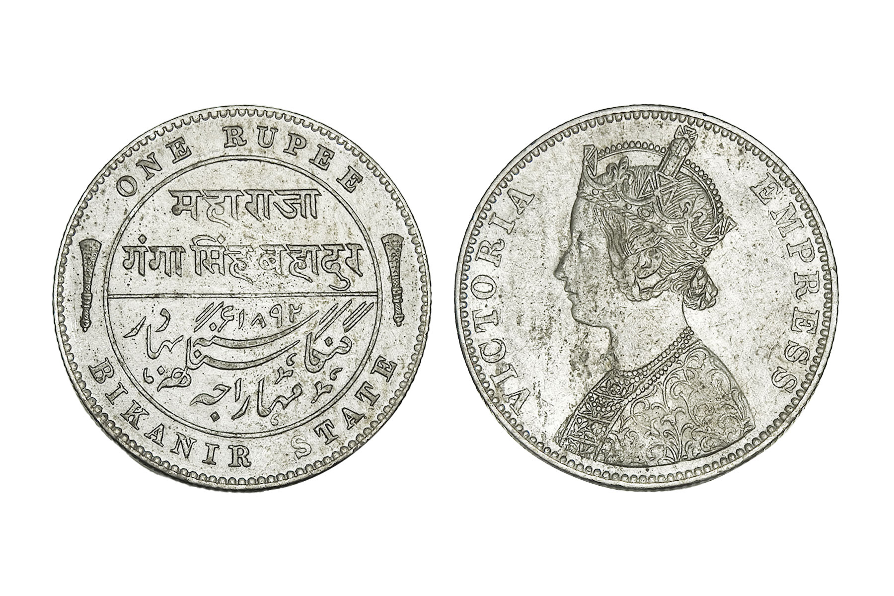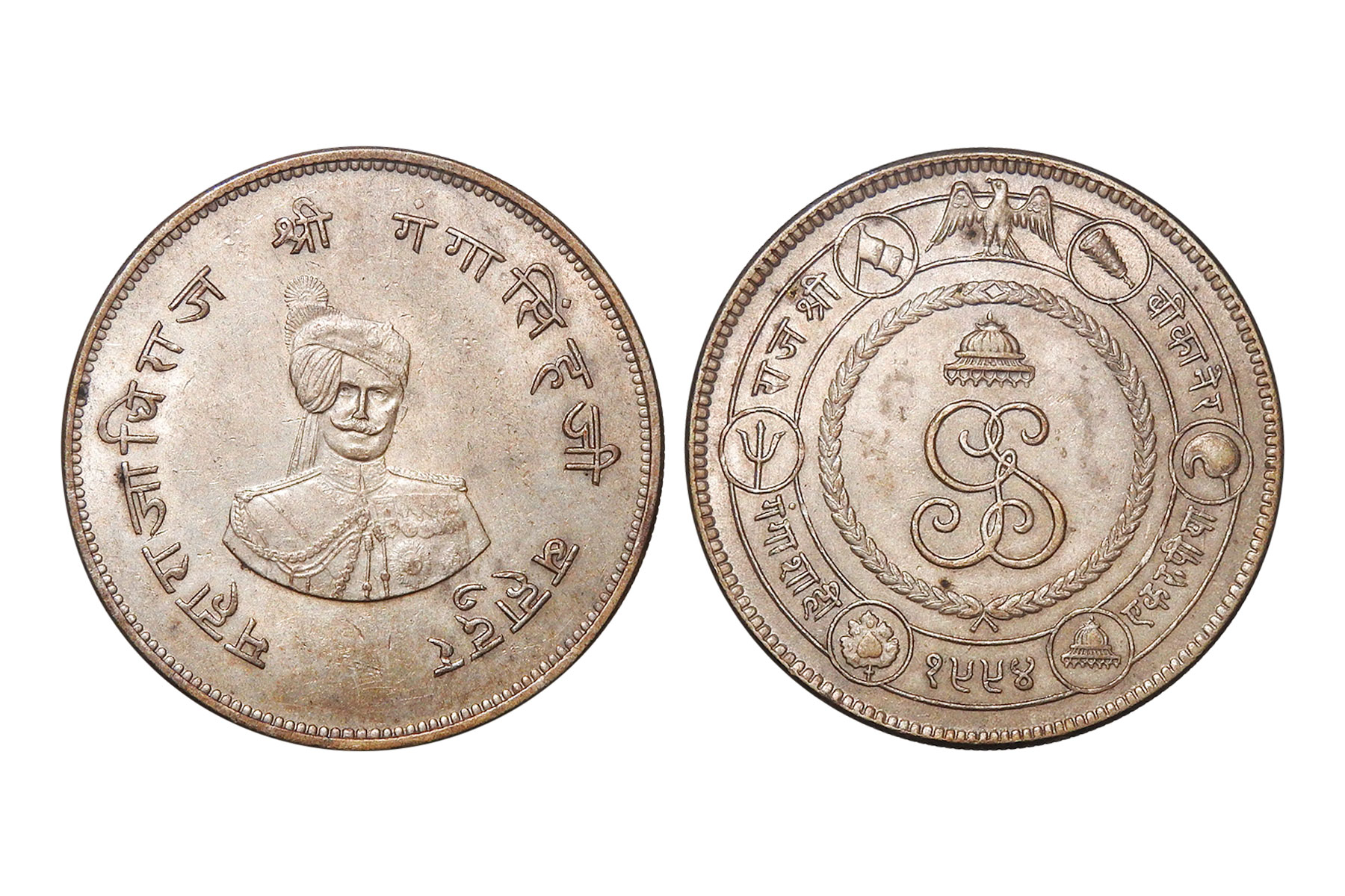 Bikaner State, Ganga Singh(c. 1887-1942CE), Silver Commemorative Nazarana Rupee, 12.97grms, Bikaner State, Ganga Singh(c. 1887-1942CE), Silver Commemorative Nazarana Rupee, 12.97grms, VS1994, Issued to celebrate 50th Anniversary of Regin, Obv. Crowned monogram with nigari legend around, Rev. Bust of the king front facing with name and date, Uncirculated with wooden cabin platina, Rare. Maharaja Ganga Singh (r. 1887–1943 AD) was the most prominent ruler of Bikaner State, known for major administrative reforms and infrastructure development. He built the Ganga Canal, transforming desert agriculture, and modernized governance, judiciary, and army. Loyal to the British, he served in World War I, represented India at the Imperial War Conference and League of Nations, and enhanced Bikaner’s political stature while maintaining strong internal autonomy.