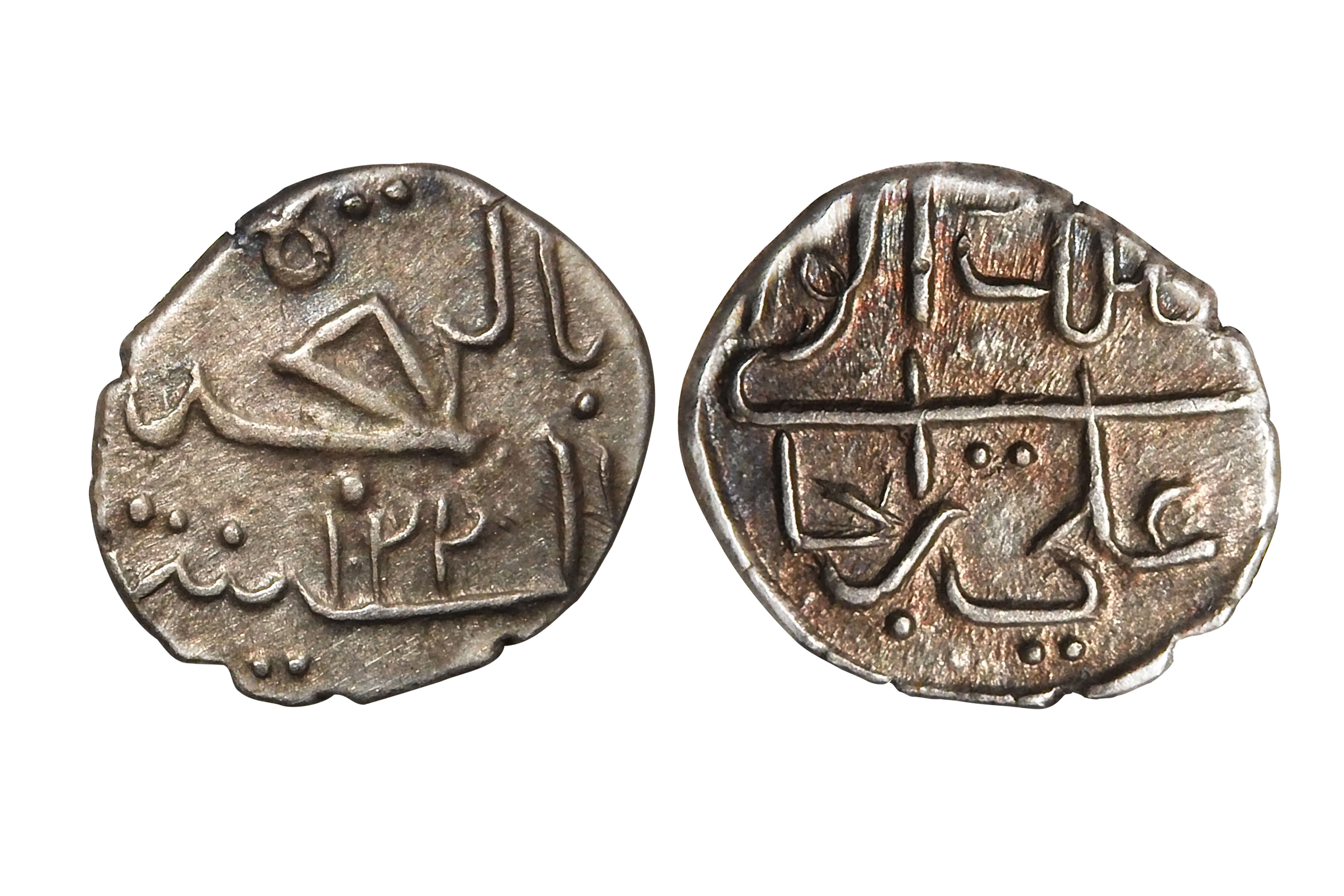 Cannanore State, Arakkal Dynasty, Ali Raja Kunhi Amsa II(c. 1745–1777CE), Silver 1/5th Rupee, 2.20grms, AH1631, Error Date for AH1231, Obv. Persian legend "Al mulk-ul wali Ali Raja", Rev. Sanah 1631AH, Uncirculated Condtion, with complete border on both sides visible, Exceedengly Rare date & error