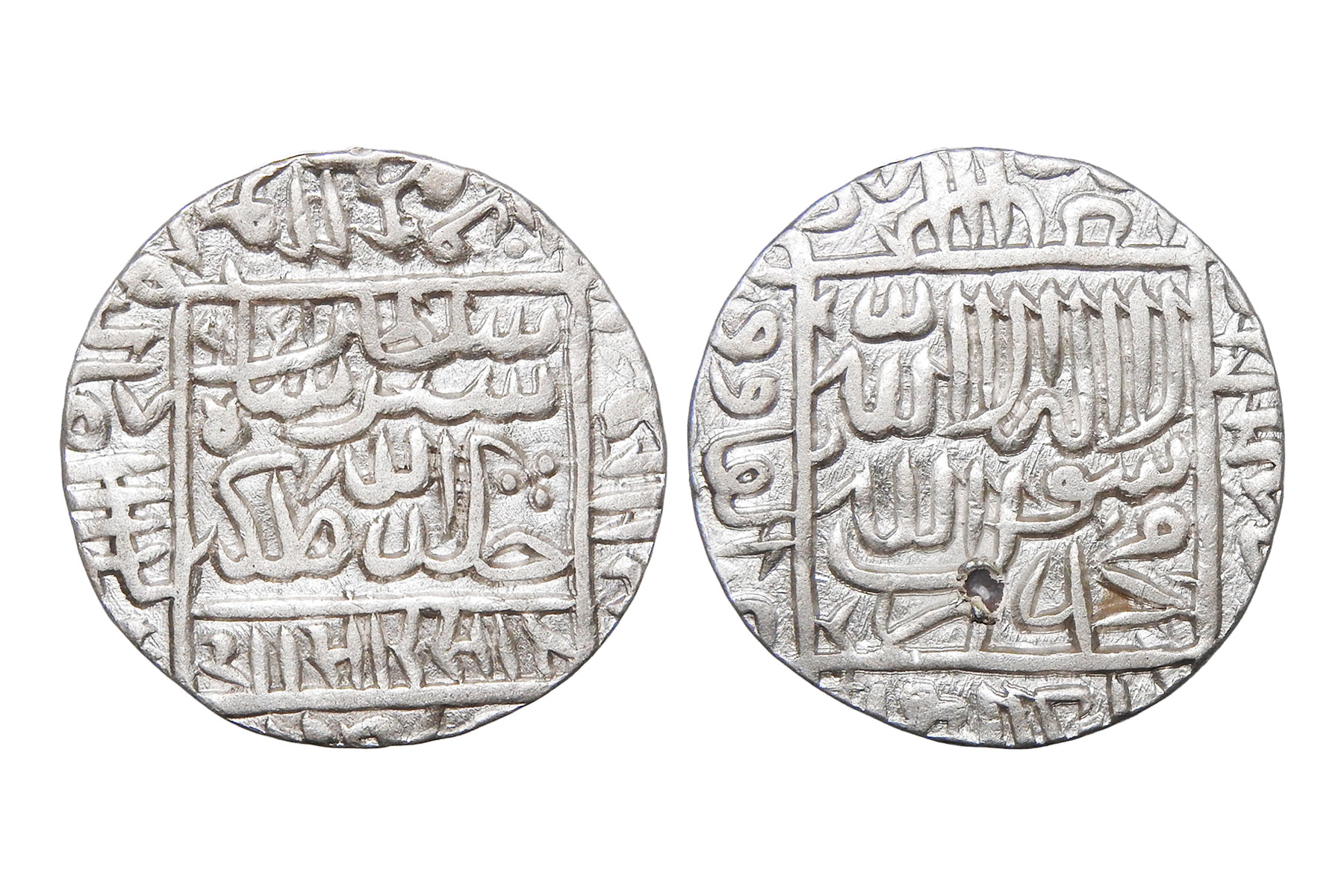 Delhi Sultanate, Suris, Islam Shah Suri(c. 1545-1552CE), Silver Rupee, 11.10grms, Mintless type, AH954, G&G#D980, Usual legends, caliphs type 3, Both sides within square, 1477 in obverse top margin. A Bengal type, probably struck at the provincial capital, Large Flan Size, Very Fine+, Scarce He crushed Afghan rebellions led by Adil Shah Suri, Ibrahim Khan, and eastern Afghan chiefs in Bihar and Bengal. He fought Rajput rulers in Malwa and Bundelkhand, besieged Gwalior, and kept constant pressure on Humayun, preventing any Mughal comeback until his death. No lasting alliances—rule sustained by force.