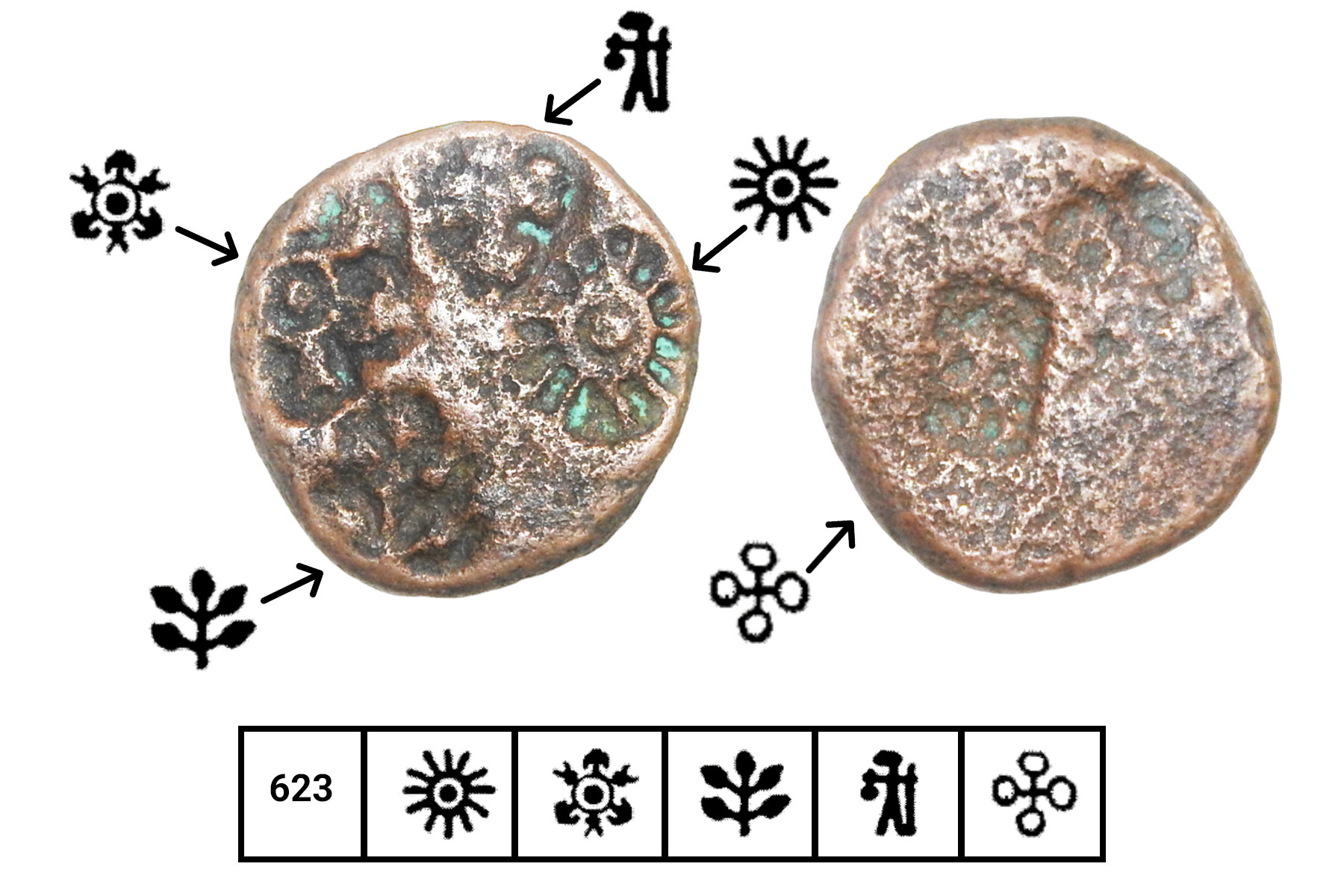 Magadha Janapadha, Brihadrata (c.187-185 BC), Copper Karshapana (3 coins), 2.90 grms, 1.80 grms & 1.20 grms, Symbols on coins: 6 Armed Symbol, Sun, 3 arched hill with a crescent above, Standing figure, Star, Crescent and many unknown symbols,Gupta and Hardaker Series 'VIII' Type #614, #618, #619, Extra Fine+, Rare with clear symbols This type is generally found in Ujjain, Vidisha and Malwa and many seem to appear with the coinage of Indo Greek king- Apollodotus II and Shunga coins, we can say that these coins where issued during the end of Mayuran rule and during the rule of Sunga empire.