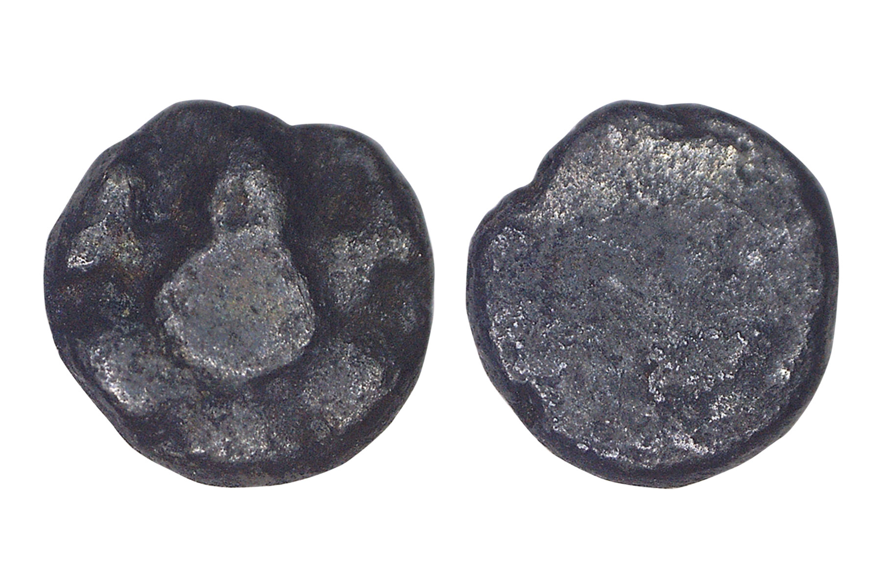 Magadha Janapadha, Nanda Dynasty (c.345-321 BC), Silver Ardha Masakas, One Ratti weight standard or 1/32 Karshapana, 0.09 grms, 1x Bull to the right with taurine symbol around on obverse, Fishman & Todd #I12, Uniface, Extra Fine, Extermeely Rare. The origin and purpose of ardha māṣikas remain debated and inconclusive. These extremely rare coins are usually found in hoards dominated by Magadha kārṣāpaṇas and are often missed in excavations due to their very small size. Their weight appears to follow the Magadha standard of approximately one ratti, indicating deliberate issue. Some scholars suggest they were trial pieces of the late Nanda or early Mauryan period, while others propose limited use for donations or tax payments. The scarcity of surviving examples points to a very low mintage, leaving their exact function uncertain