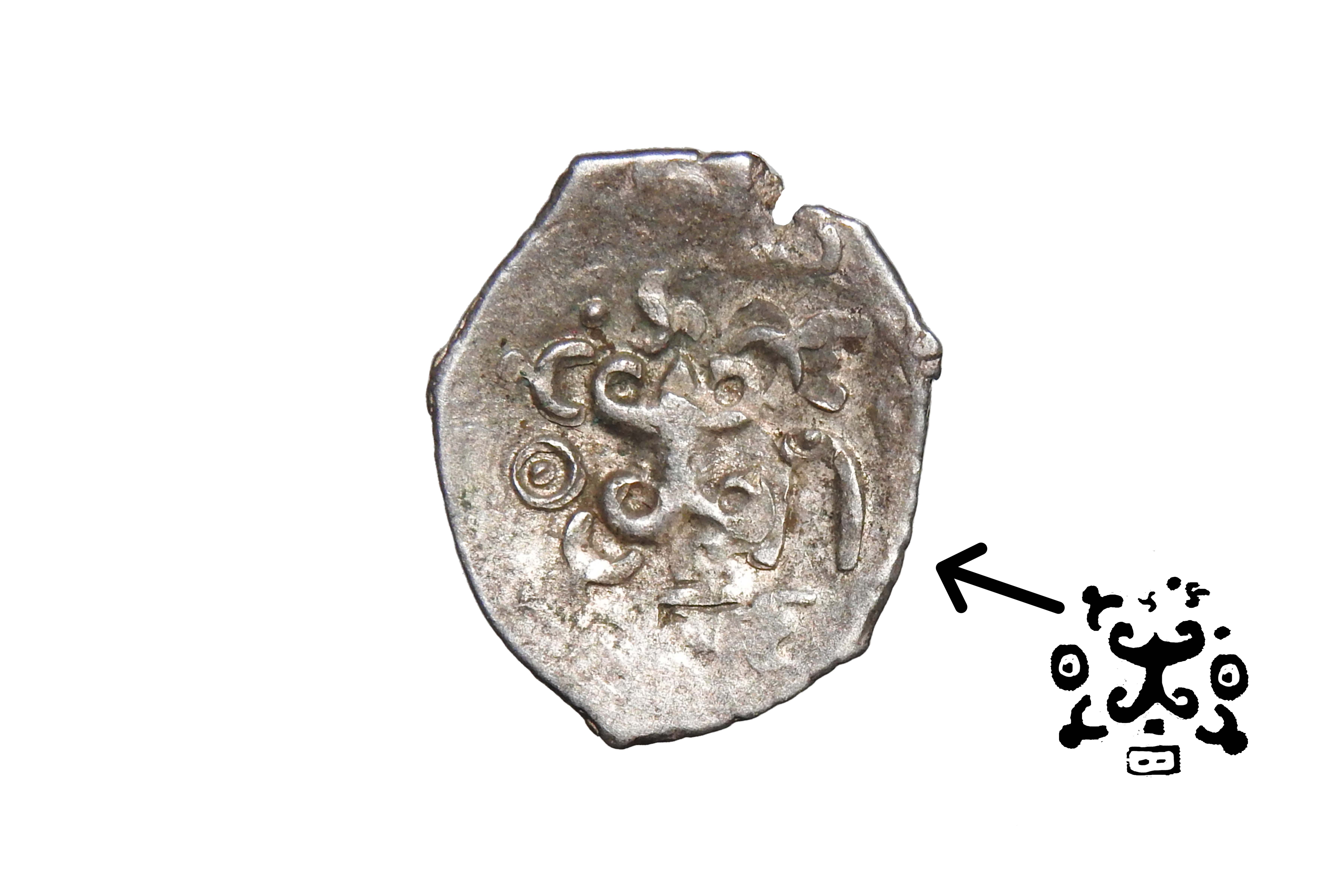 Magadha Janapadha, Nanda Dynasty (c.345-321 BC), Silver Ardha Masakas, One Ratti weight standard or 1/32 Karshapana, 0.10 grms, 1x 6 armed symbol on obverse, Fishman & Todd #A22, Uniface, Extra Fine, Extermeely Rare. The origin and purpose of ardha māṣikas remain debated and inconclusive. These extremely rare coins are usually found in hoards dominated by Magadha kārṣāpaṇas and are often missed in excavations due to their very small size. Their weight appears to follow the Magadha standard of approximately one ratti, indicating deliberate issue. Some scholars suggest they were trial pieces of the late Nanda or early Mauryan period, while others propose limited use for donations or tax payments. The scarcity of surviving examples points to a very low mintage, leaving their exact function uncertain