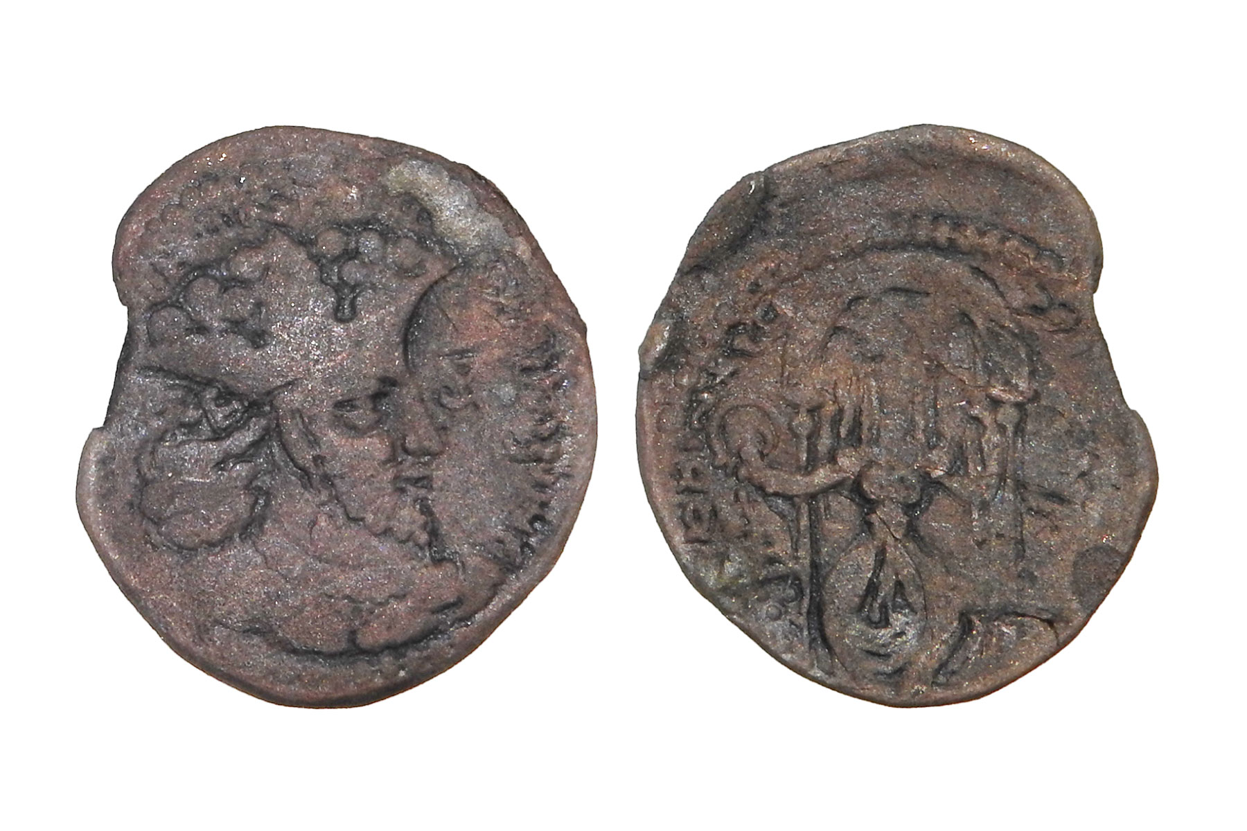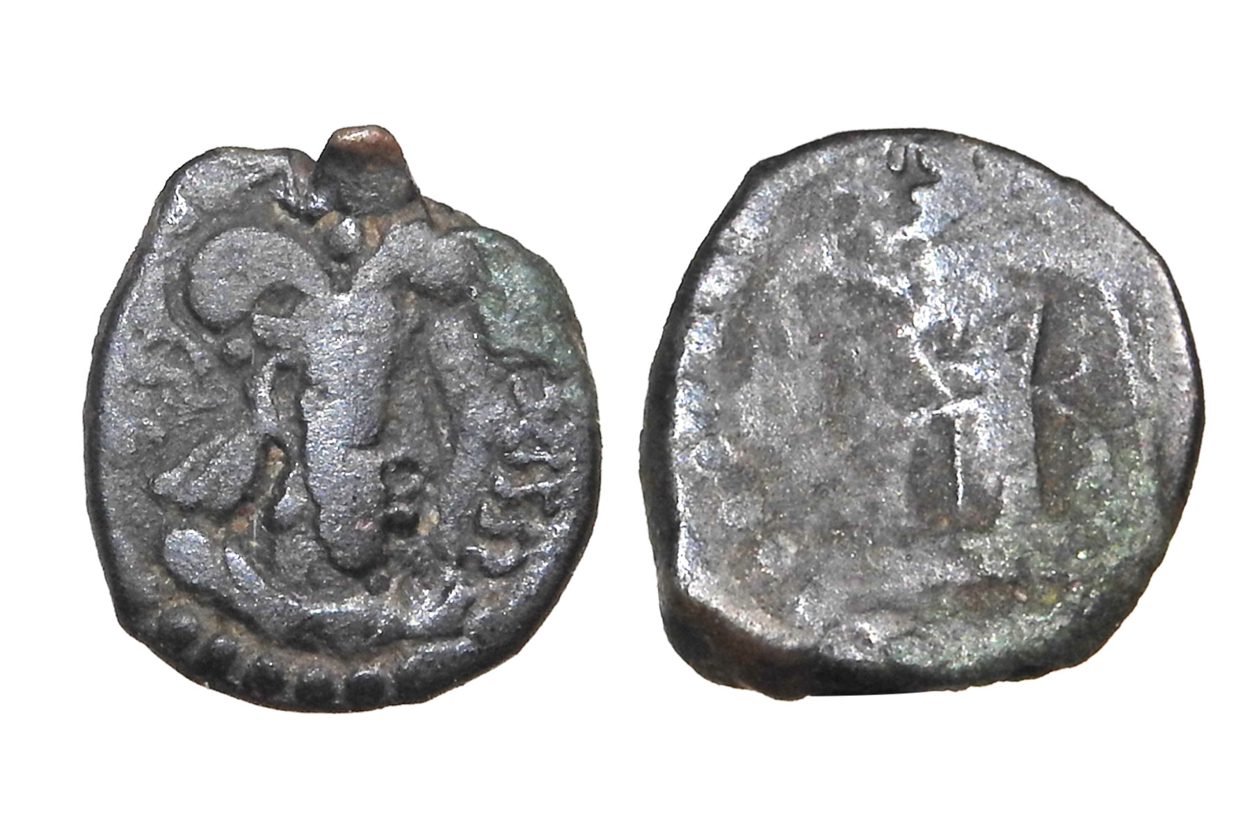 Kushano-Sasanian Kingdom, Varahana, Copper Unit, 1.30 grms, Obv: Bust of king to right in ram's horns crown with top decoration, Pahlevi legend, Rev: Deity rising from altar type, Very Fine+, Rare. Varahana ruled during escalating conflict on the eastern Sasanian frontier. He faced sustained pressure from the Kidarites, an advancing Hun group displacing Kushano-Sasanian authority in Bactria and Gandhara, alongside resistance from residual Kushan local rulers. His reign was dominated by defensive warfare against Kidarite expansion. To hold territory, he relied on alliances with local Indo-Iranian elites and frontier chiefs, seeking military cooperation to counter Hun advances and delay the collapse of Kushano-Sasanian