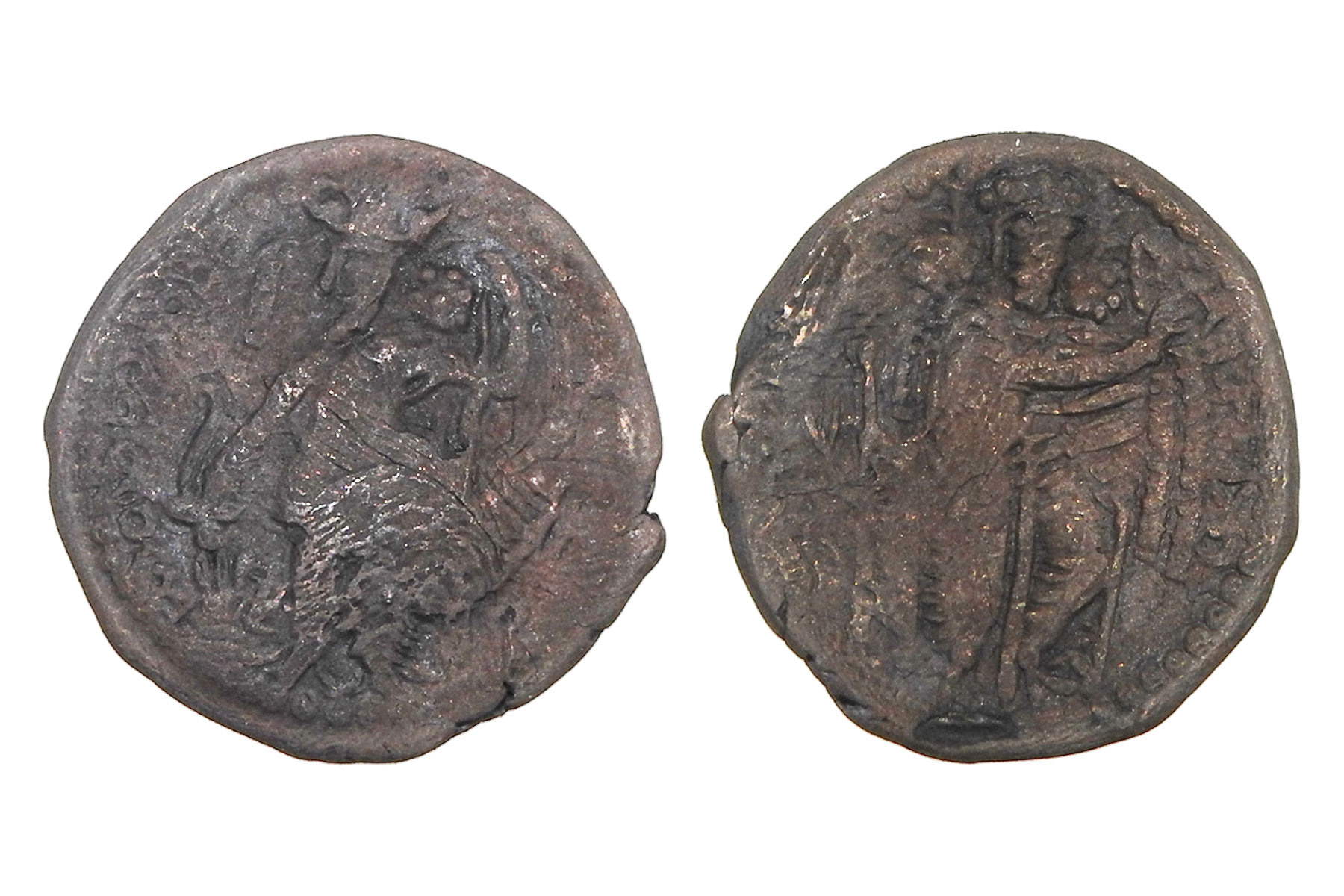 Kushano-Sasanian Kingdom, Ardashir I (c. 224-241CE), Copper Unit, 2.40grms, Anahita Type/ Bactrian Series, Obv: King's bust right in turreted crown, Pahlavi legend right, Rev: Anahita seated in niche offering wreath of -investiture with her right, spear in her left, Pieper#1949, Rare king and type. The Kushano-Sasanian Kingdom emerged as a frontier power after the Sasanians challenged Kushan dominance in the eastern Iranian world. Ardashir I, a Kushano-Sasanian ruler, established authority over regions of Bactria and north-western India, asserting Sasanian influence beyond Iran. His rule was shaped by military confrontation with residual Kushan forces and the need to secure contested borderlands. Through warfare and strategic control of key territories, Ardashir I reinforced Sasanian political expansion while adapting to local conditions. His reign marks the transition from Kushan supremacy to Sasanian-aligned rule in the eastern region