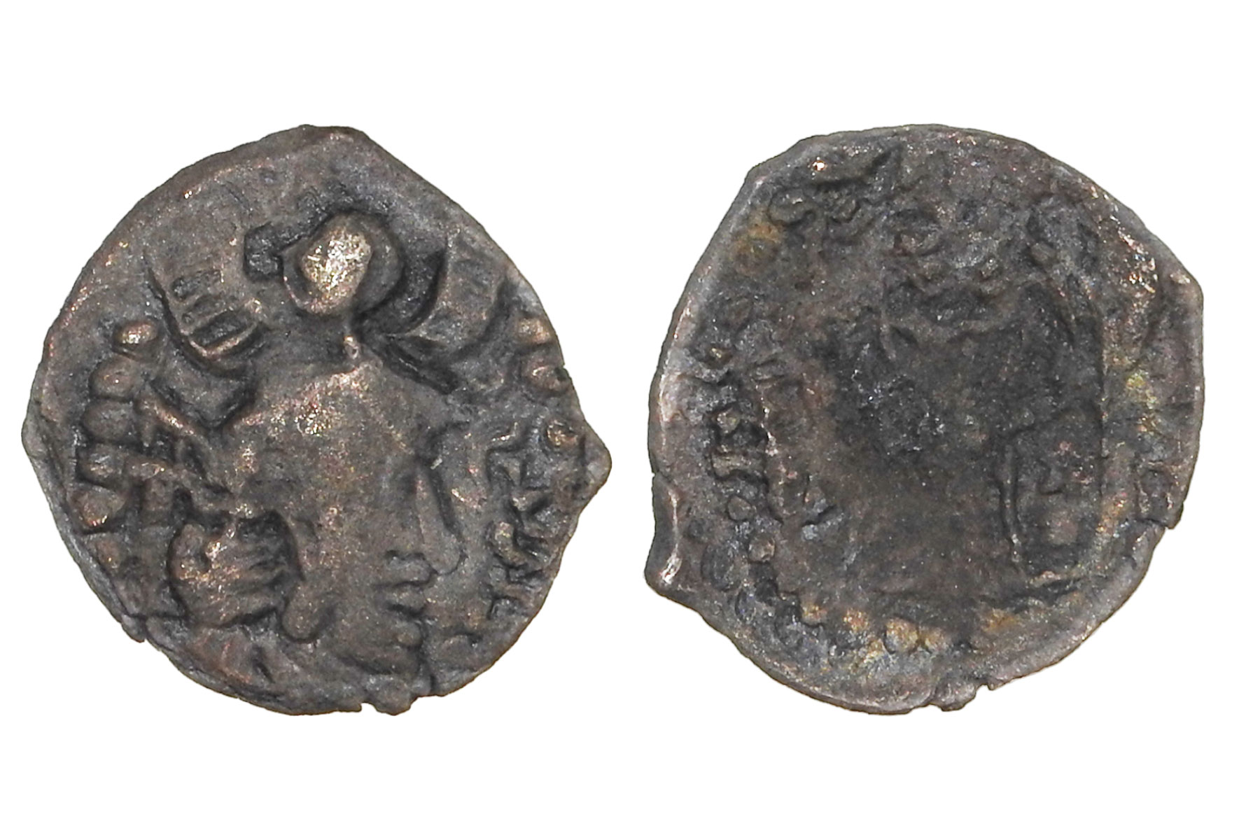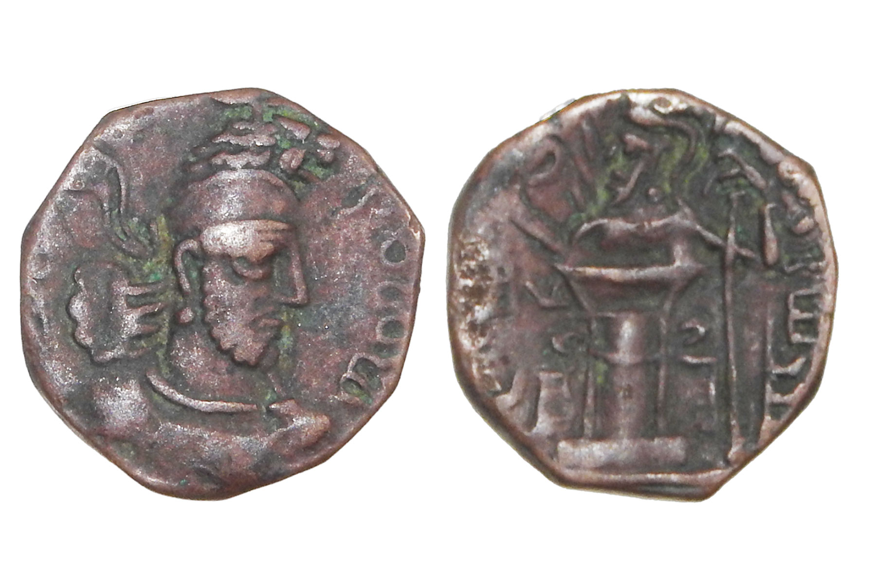 Kushano-Sasanian Kingdom, Peroz II, Copper Unit, 1.10 grms, Obv: Bust of king to right but crown with bull horn decorations and 'globe-artichocke' with legend on right, Rev: Male deity rising from altar. Pieper#1959, Extra Fine, Rare Peroz II faced direct conflict from residual Kushan dynasts in Bactria and Gandhara and growing pressure from Central Asian nomadic groups, including early Chionite–Hun elements, threatening eastern Sasanian control. His rule focused on defending territory rather than expansion. To counter these threats, he relied on alliances with local Indo-Iranian elites and regional chiefs who governed frontier districts. These alliances were pragmatic, aimed at military support and border stability against Kushan resurgence and nomadic incursions.