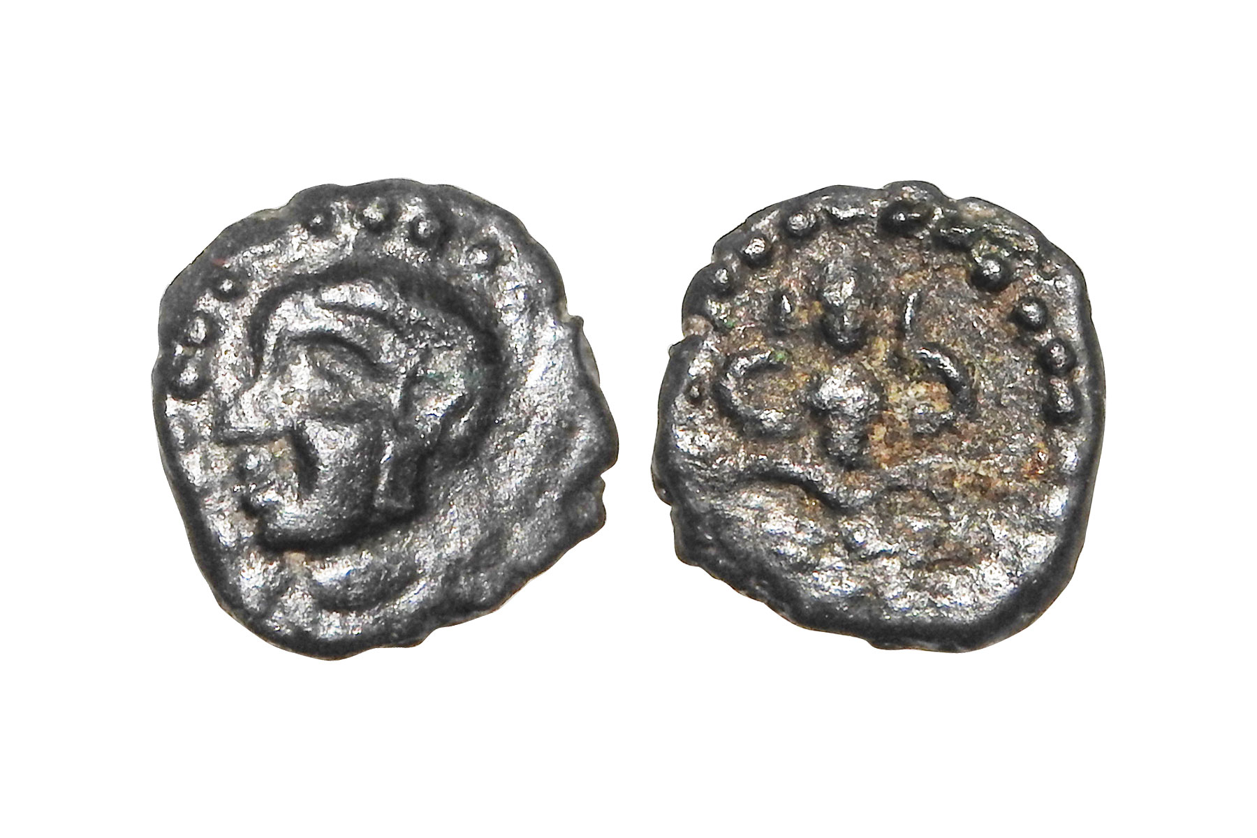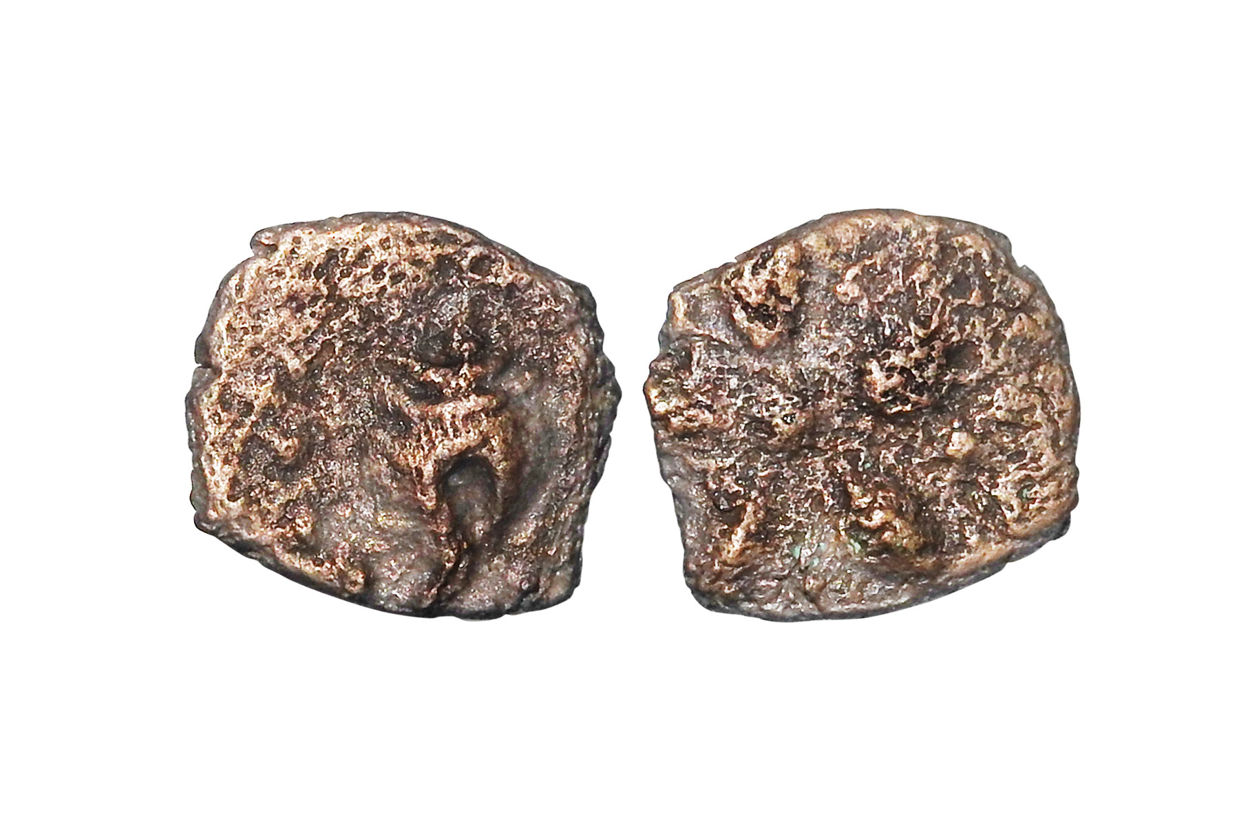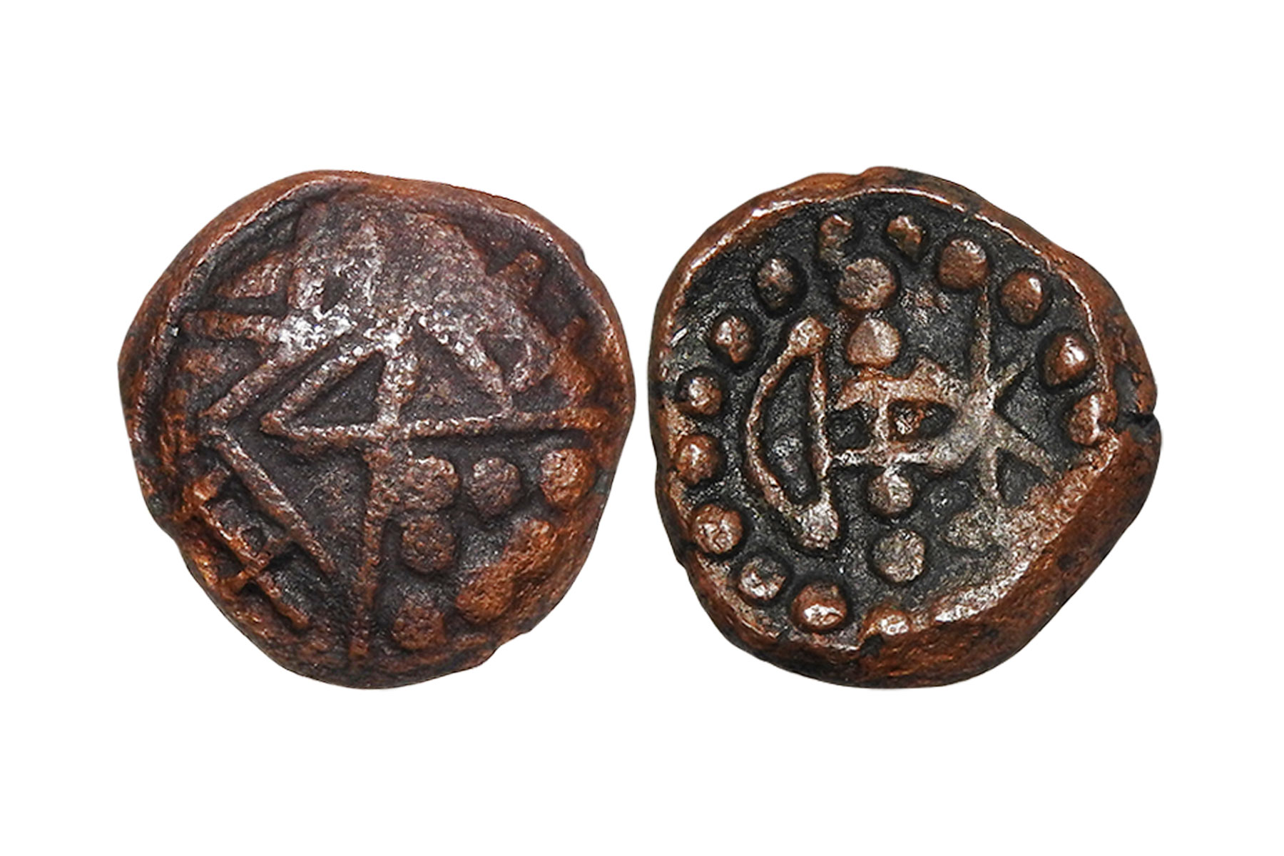 Chahamanas of Nadol - uninscribed and unattributable Copper coin, not listed in major sources, c.800-1000 AD, 1.90 grams. Obv: Conch shell (Shankha). Rev: six-petal lotus flower. VF, Rare.