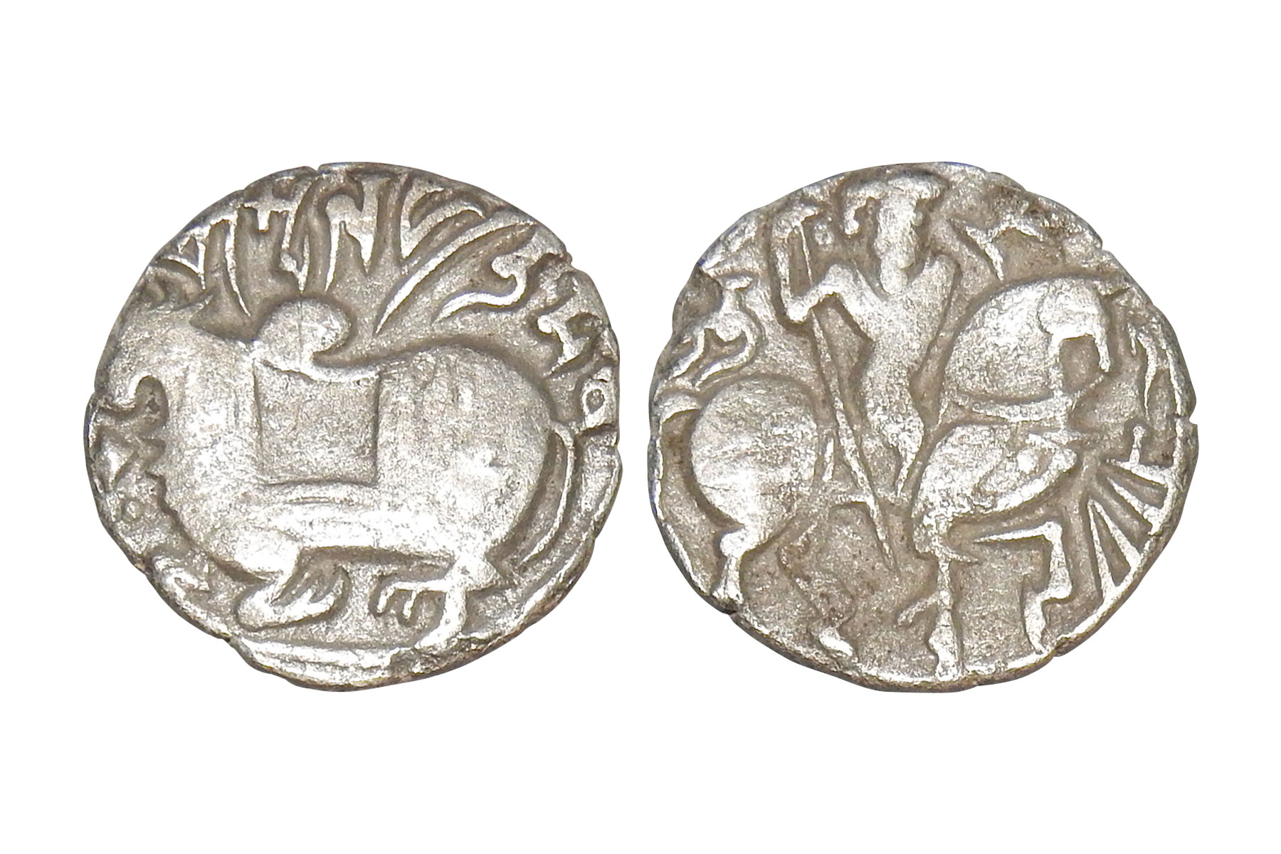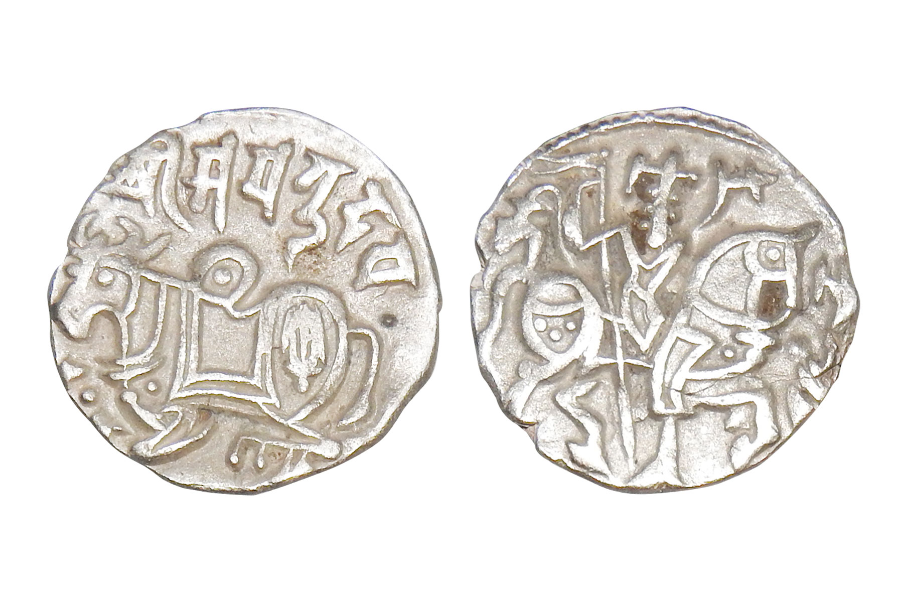 Hindu Shahis of Ohind - Silver drachm of Spalapati Deva, c.750-900 AD, Tye-2, 2.90 grams. Obv: recumbent bull facing left, Sharada legend Shri Spalapati Deva above Rev: horseman, with undeciphered legend said to be in the Tokharian script to right. VF+, Scarce.