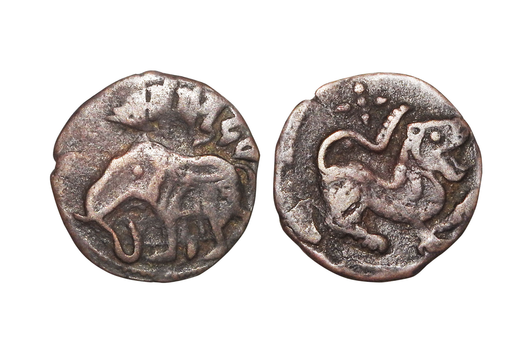 Hindu Shahis of Ohind - Copper coin of Samantadeva (c.950-1050 AD), Deyell 54, 2.60 grams. Obv: elephant walking to left, Sharada legend Shri Samantadeva above Rev: roaring lion raising his paw facing, right. VF, Very Scarce.