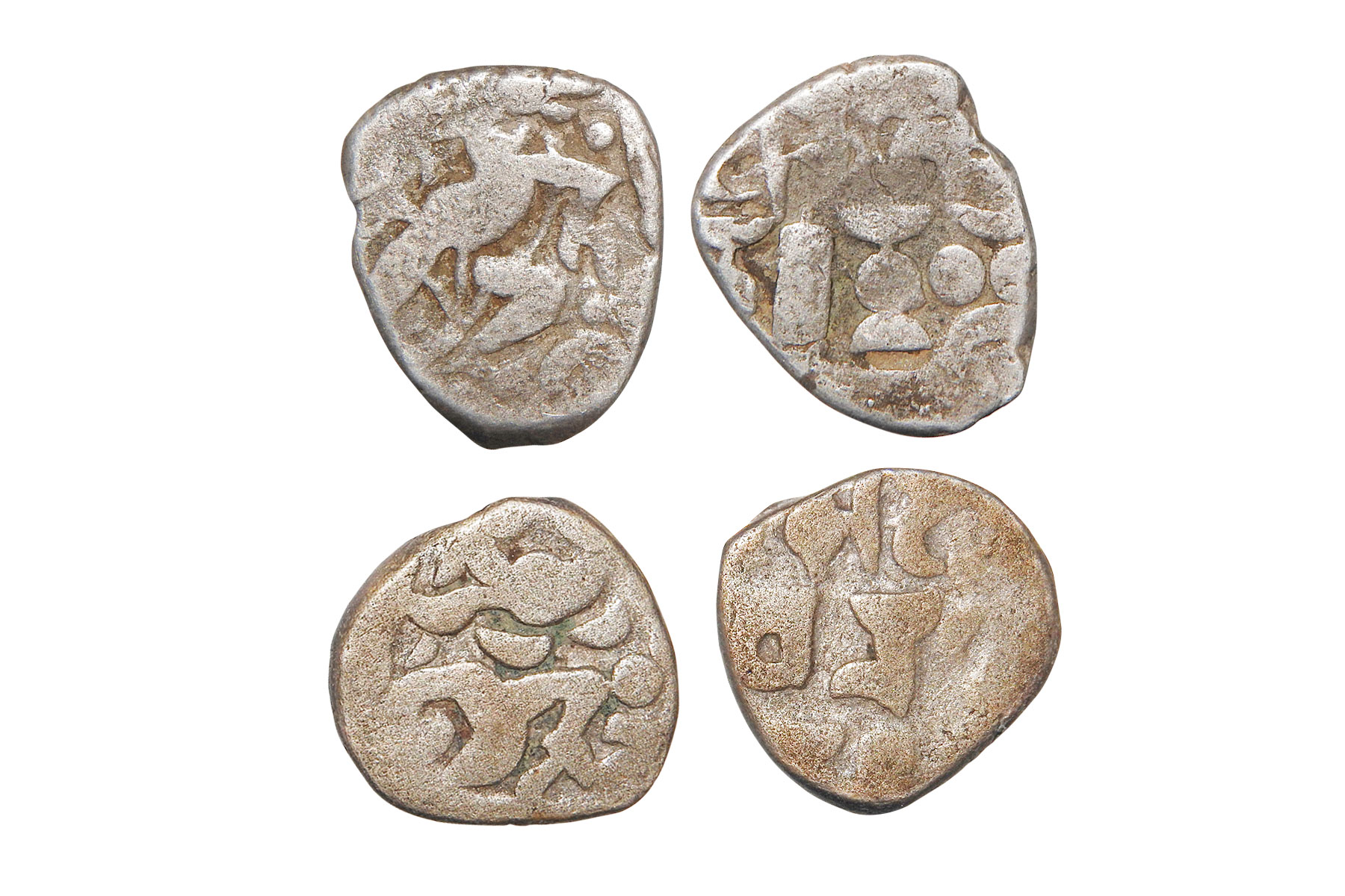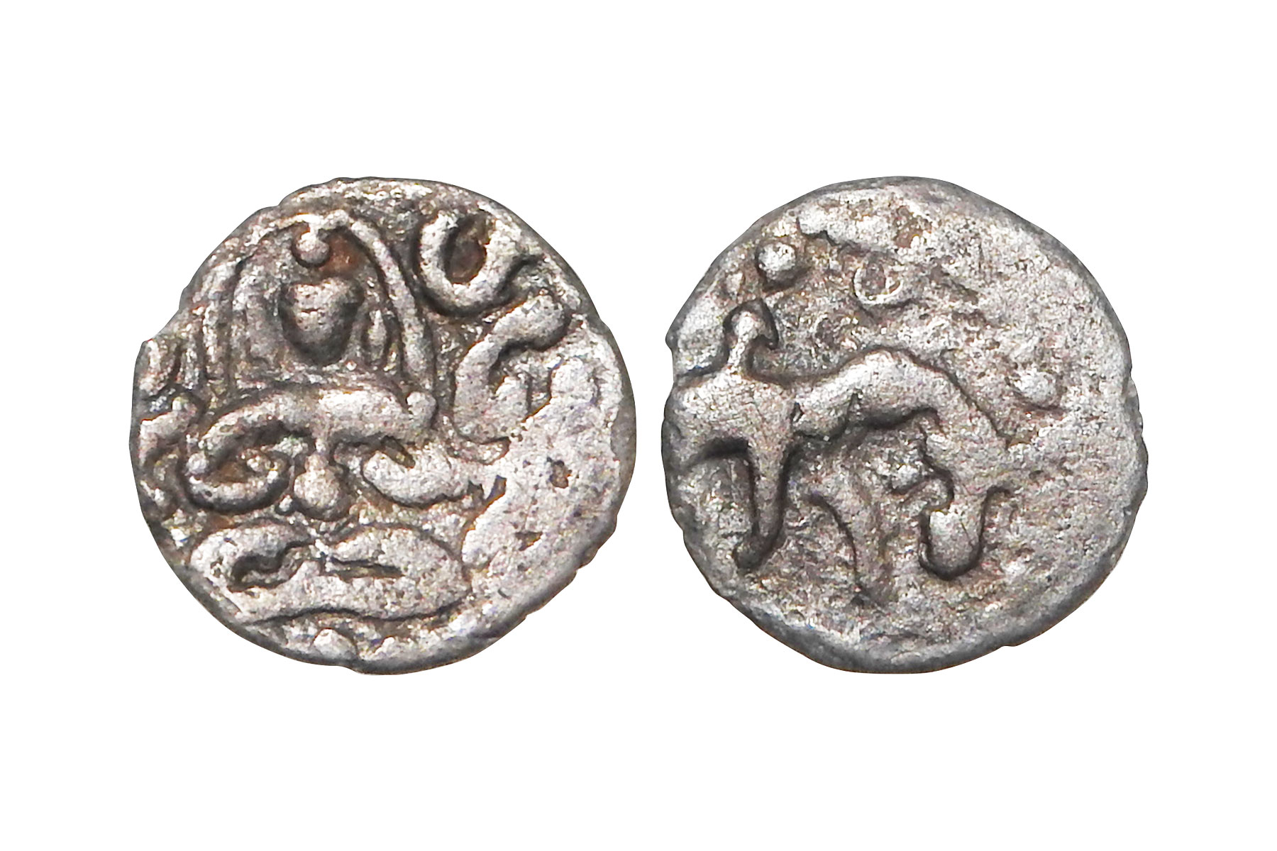Gurjara-Pratiharas - two billon drammas of Bhoja I (836-885 AD), so called 'Adivaraha', Deyell 8, 3.60 and 3.80 grams. Obv: Varaha facing right, holding the earth on his tusks. Rev: Devanagari legend Srimadadi Varaha in two lines. VF, Scarce.