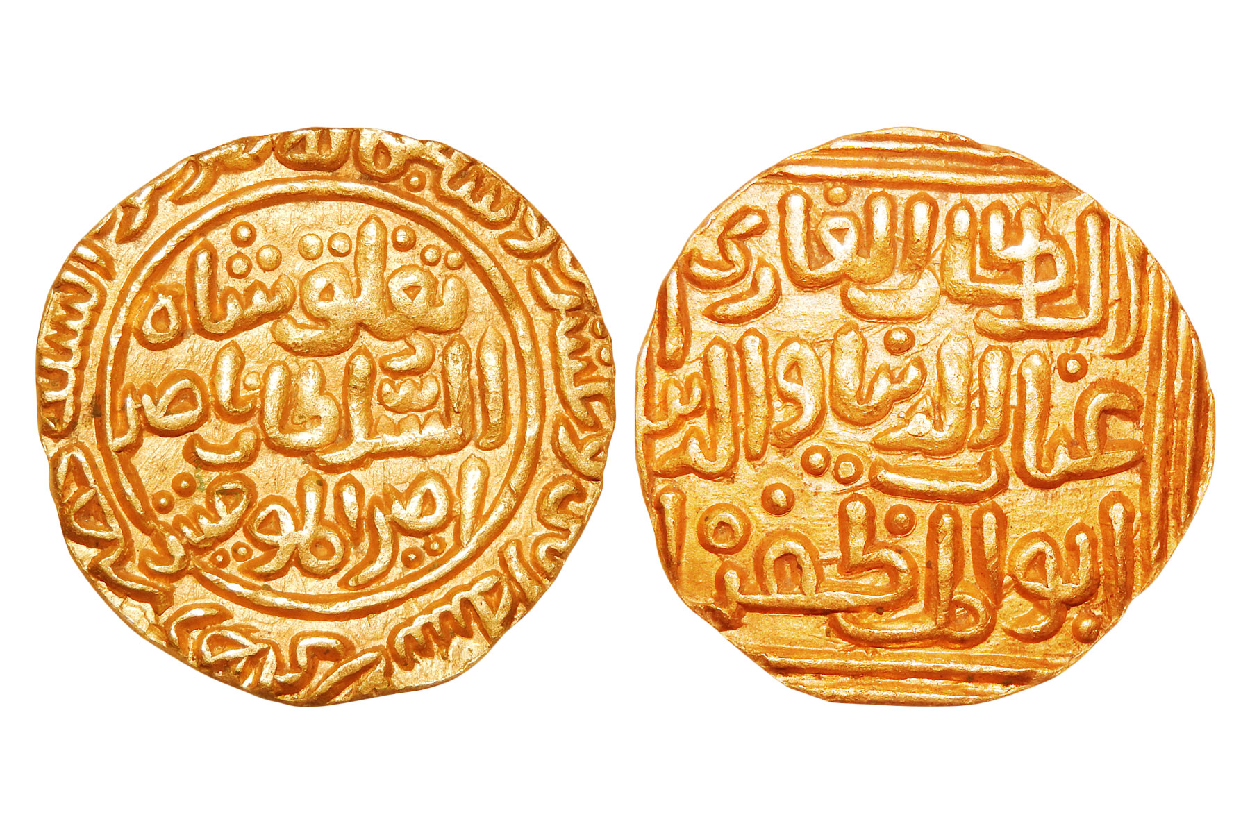Sultans of Delhi, Tughlaq dynasty - Ghiyath al-Din Tughlaq (1320-1325 AD), Gold Tanka, Hadrat Delhi mint, AH 722, G&G D301, 11.00 grams. Obv: Arabic legend al-Sultan al-Ghazi Ghiyath al-dunya wa al-din abu al-Muzzafar. Rev: Arabic legend Tughluq Shah al-Sultan Nasir Amir al mumineen in circle, date and mint details in the margin. About Uncirculated. Scarce.