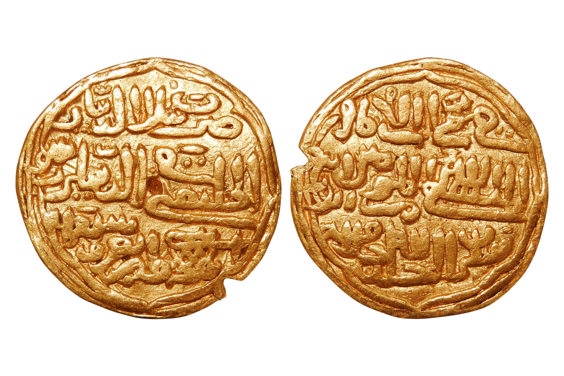 Sultans of Delhi, Tughlaq dynasty - Muhammad bin Tughlaq (1325-1351 AD), Gold Dinar, struck in the name of Caliph al-Mustakfi of Baghdad, Delhi mint, AH742, G&G D427, 10.80 grams. Obv: Arabic legend Fi Zaman al-Imam al-Mustakfi Billah Amir al Mumineen Abu Rabi'i Sulaiman Khallada Allah Khilafatahu. Rev: Arabic legend Duriba Hadha al-Dinar al-Khilafati fi al-Delhi Shuhur followed by date in words. VF+, Scarce.