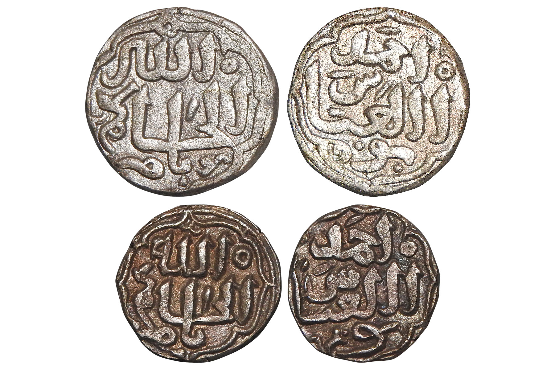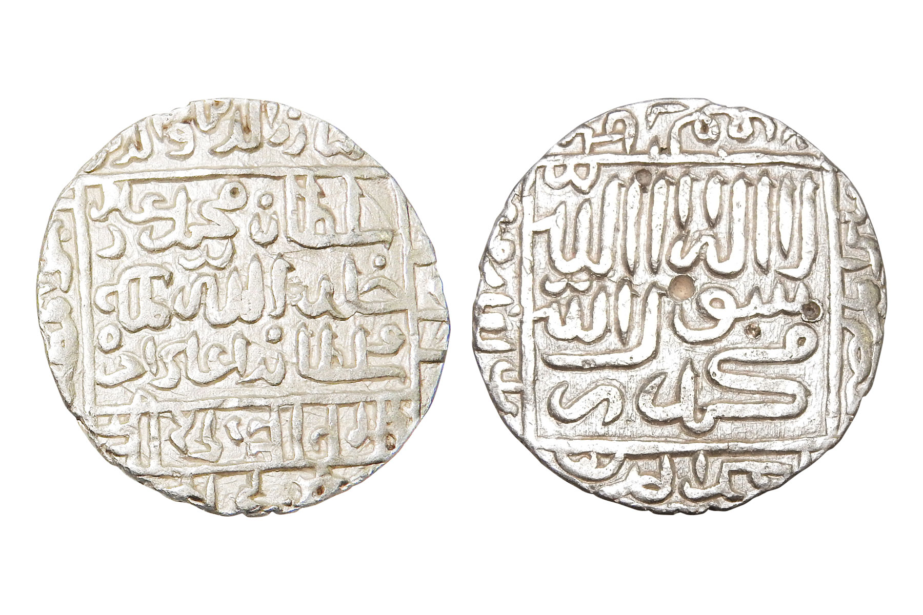 Sultans of Delhi, Tughlaq dynasty - two billon coins attributed to Muhammad bin Tughlaq (1325-1352 AD), 1 tanka and 32-rati fractional tanka, struck in the name of Hakim II, the Abbasid Caliph, mint-less and date-less types, G&G D448 and D450, weights 9.00 grams and 3.60 grams respectively. Obv: Arabic legend al-Hakim ba-Amr Allah. Rev: Arabic legend Ahmad Abu al-Abbas. VF+, Scarce.