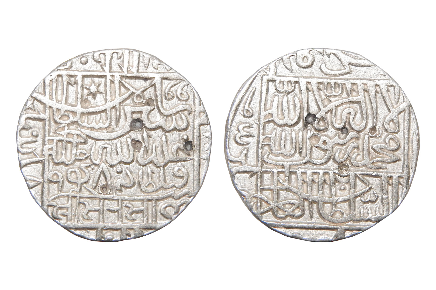 Sultans of Delhi, Suri dynasty - Silver Rupee of Islam Shah (1545-1552 AD), mintless '1477' type, AH 959, G&G D980, 11.40 grams. Obv: Arabic legend in rectangle Islam Shah bin Sher Shah Sultan Khallada Allah Mulkahu followed by AH date, Nagari Shri Isalama Sahi below Rev: Kalima within a square, names, and titles of four Caliphs in margins. VF+, Scarce.