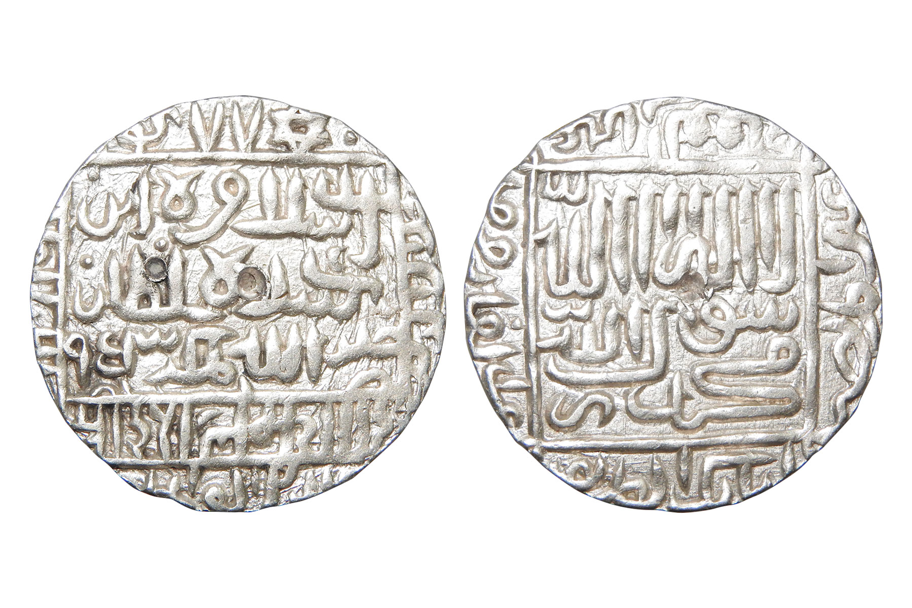 Sultans of Delhi, Suris - Silver Rupee, Sher Shah (1538-1545 AD), Shergarh 'urf Hadrat Dehli mint, AH 949, G&G D806, 11.30 grams. Obv: Arabic legend al-Sultan Sher Shah Khallada Allah Mulkahu in the rectangle with date in numbers; other titles in the bottom and left quadrant, mint-name in the top and right quadrant. Rev: Shahada in rectangle, names of Rashidoon Caliphs and titles around. VF+, Scarce.