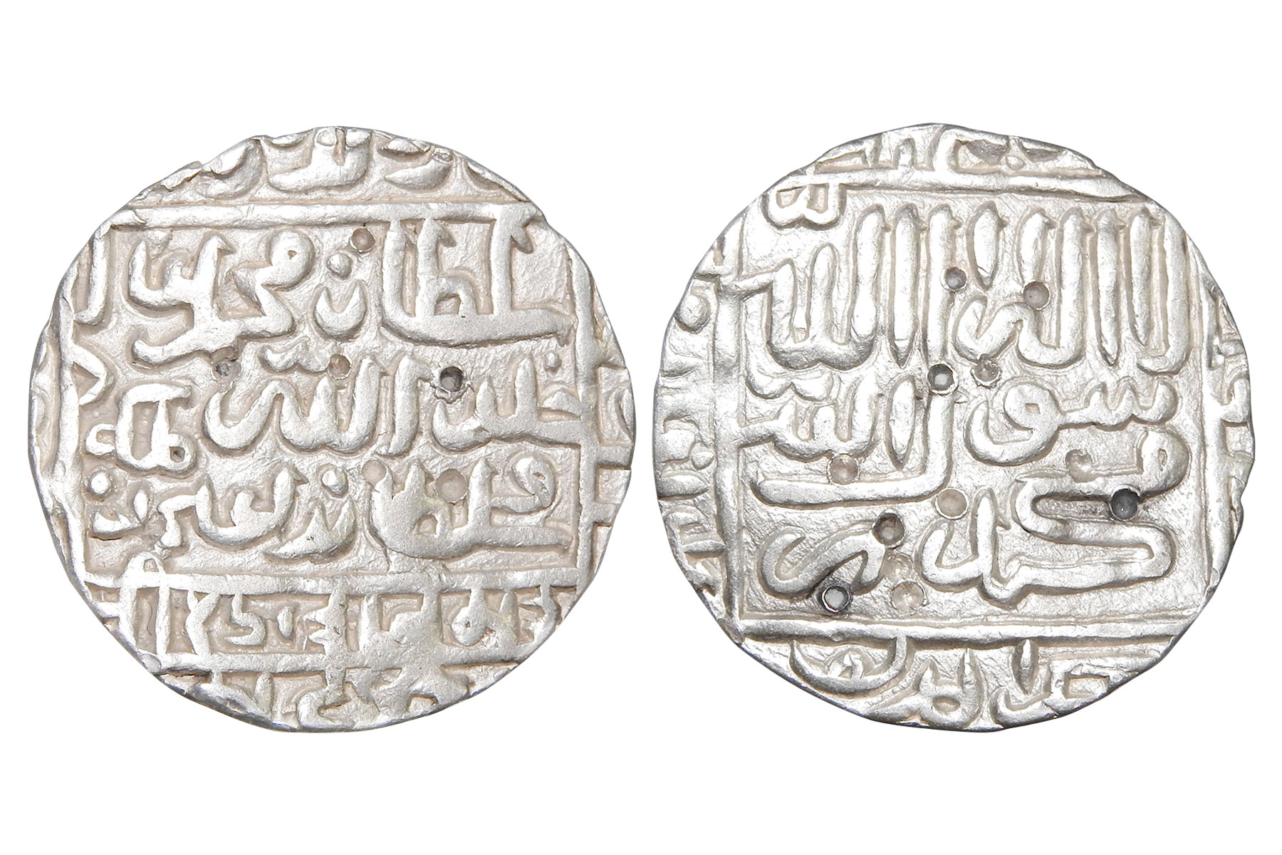 Sultans of Delhi, Suri Dynasty - Silver Rupee of Muhammad Adil Shah (1552-1556 AD), mintless type, G&G D1105, 11.30 grams. Obv: Arabic legend in rectangle Sultan Muhammad Adil Khallada Allah Mulkahu wa Saltanahu A'ala Amrahu and in Nagari Shri Sultan Mahamada below. Rev: Kalima within a square, names and titles of four Caliphs in margins. VF+, Scarce.