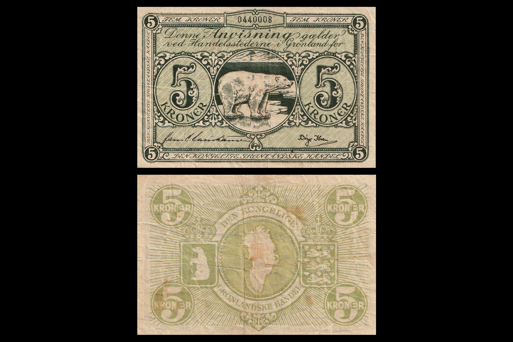 Greenland, 5 Kroner, 1953-1967. Obv- Polar Bear In The Middle. Rev- Map Of Greenland In The Middle. Surrounded By Text. Flanked By 2 Crowned Shields. At The Left Greenlands Shield (Sitting Polar Bear), And At The Right Denmarks Shield (3 Lions And 9 Hearts). Value In The Four Corners. XF+, Exceedingly Rare.