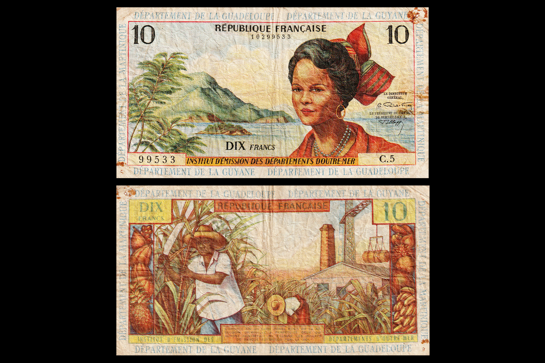French West Indies (Overseas France), 10 Francs, 1964, Obv- Green on multicolor underprint. Banana harvest. Rev- Shoreline with houses at left, man and woman at right. VF+, Scarce. NR-49.