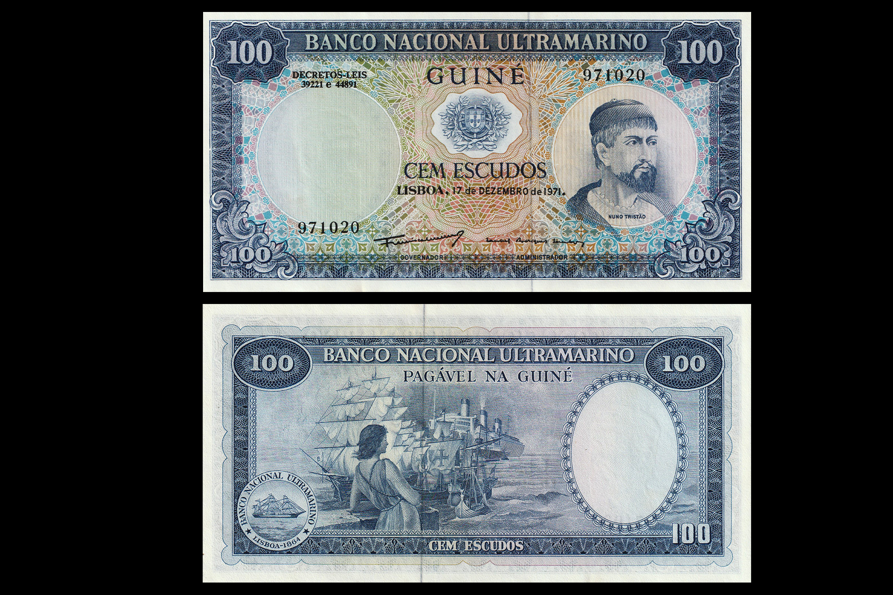 Portuguese Guinea (1910-1975), 100 Escudos, 1971. Obv- Portuguese arms at upper center; portrait of Nuno Trist