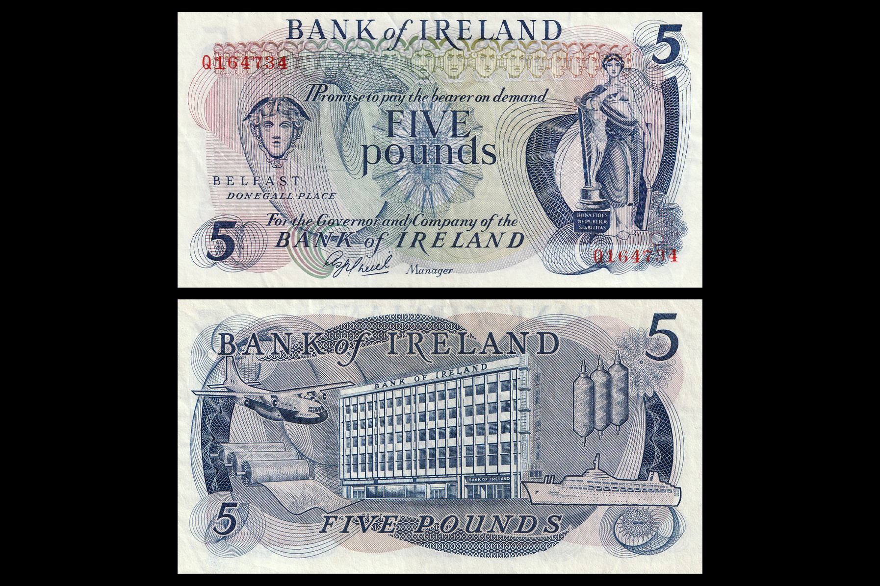 Northern Ireland (United Kingdom), 5 Pounds, 1967. Obv- Hibernia at right. Rev- Bank of Ireland building in centre, Aeroplane and textile rolls at left, Thread rolls and SS Canberra at right. UNC, Scarce. NR-97.