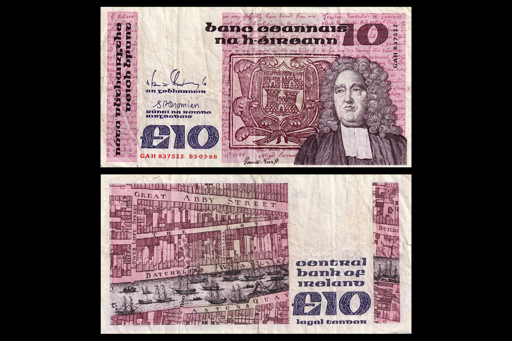Ireland, 10 Pounds, 1978-1992. Obv- Jonathan Swift (poet and satirist). Coat of arms of Dublin in centre. Rev- Map of Dublin published by John Rocque in 1756. UNC, Scarce. NR-48.