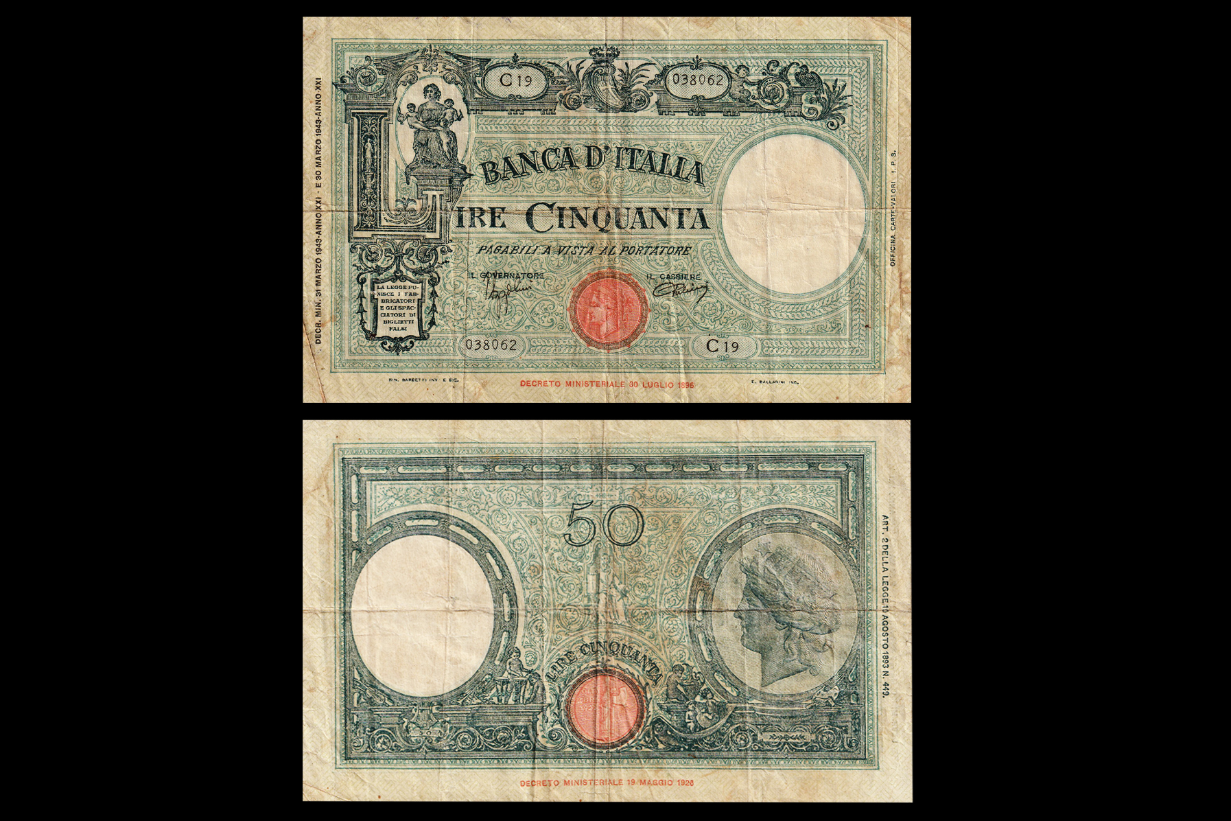 Italy, 50 Lire, 1943, Obv- Banca D'Italia, Lire Cinquanta, Pagabili a vista al portatore. Rev- Fasces seal. VF+, Scarce. NR-62.