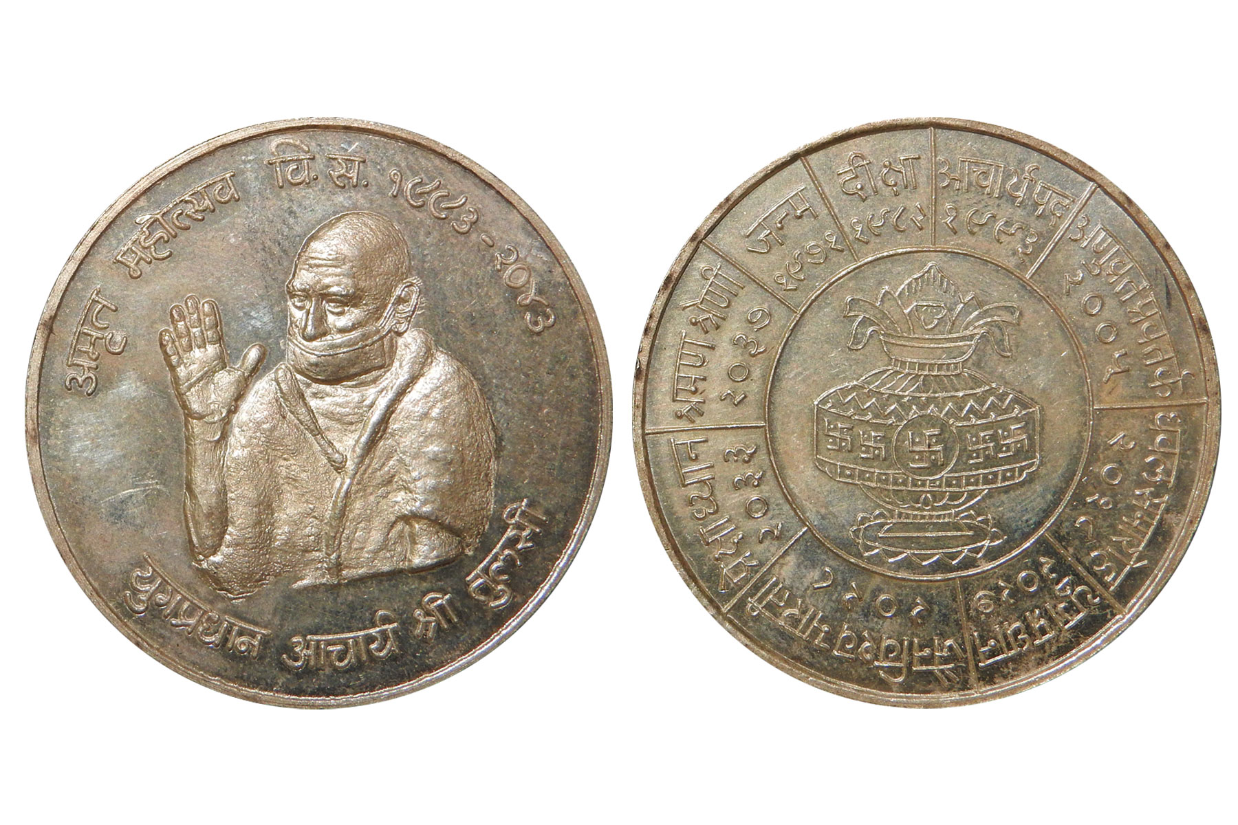Circular silver coin, Obv. Amrutha Mahotsav Vikram Samarth 1993-2043 Yug Pradhan Shri Acharya Tulsi, Rev. Decorated pooja Kalash with other details of Shri Acharya Tulsi. 10.30 grams.