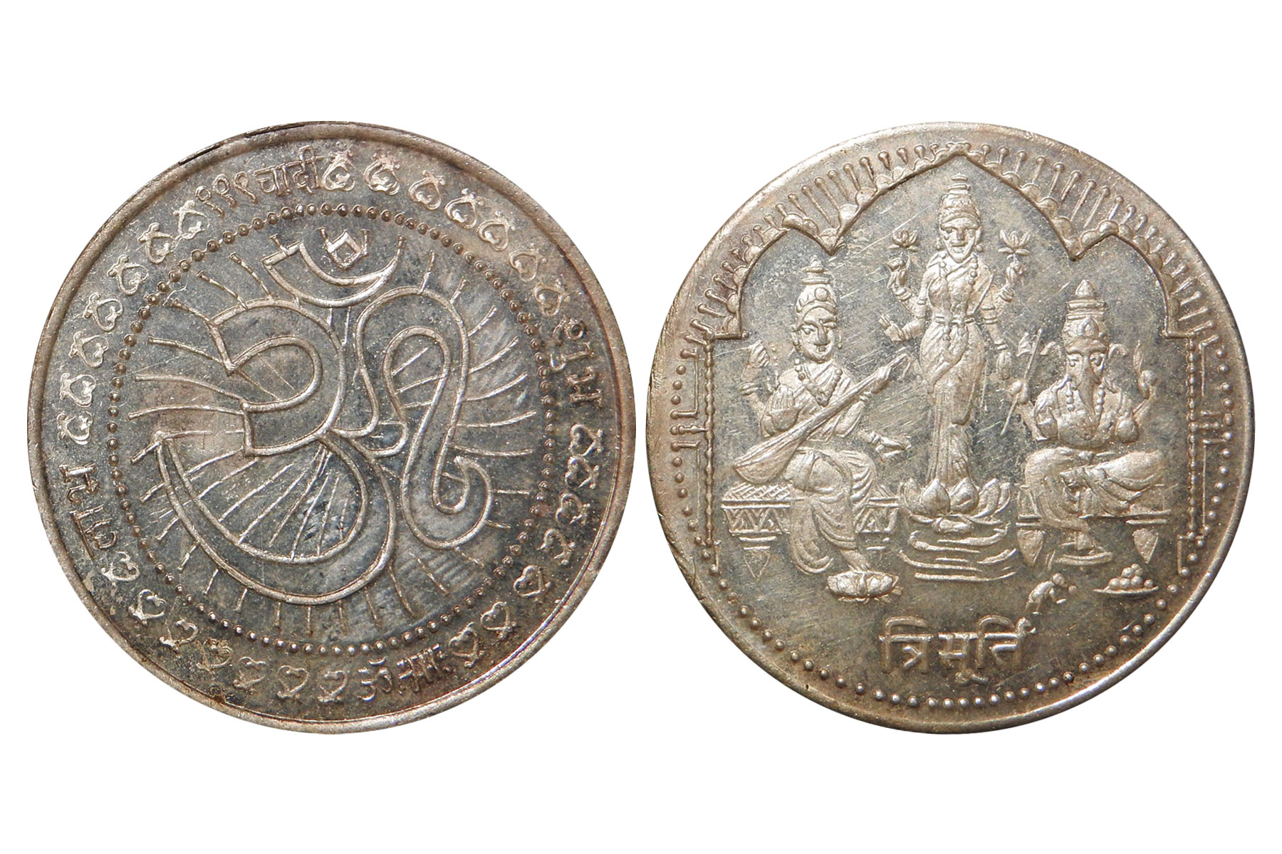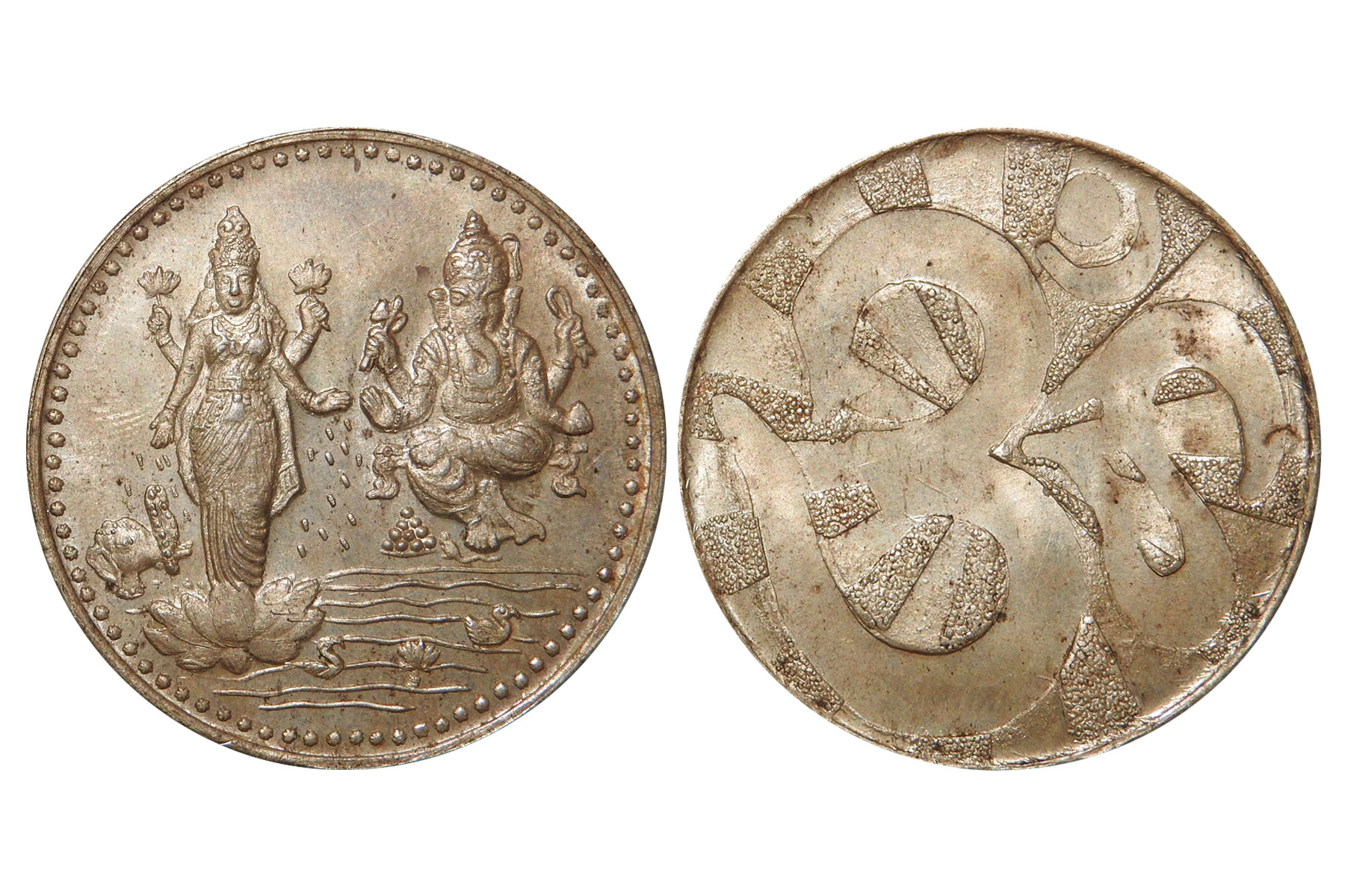Circular silver coin, Obv. Om, Rev. Lakshmi, Saraswathi, and Ganesha. 6.90 grams.