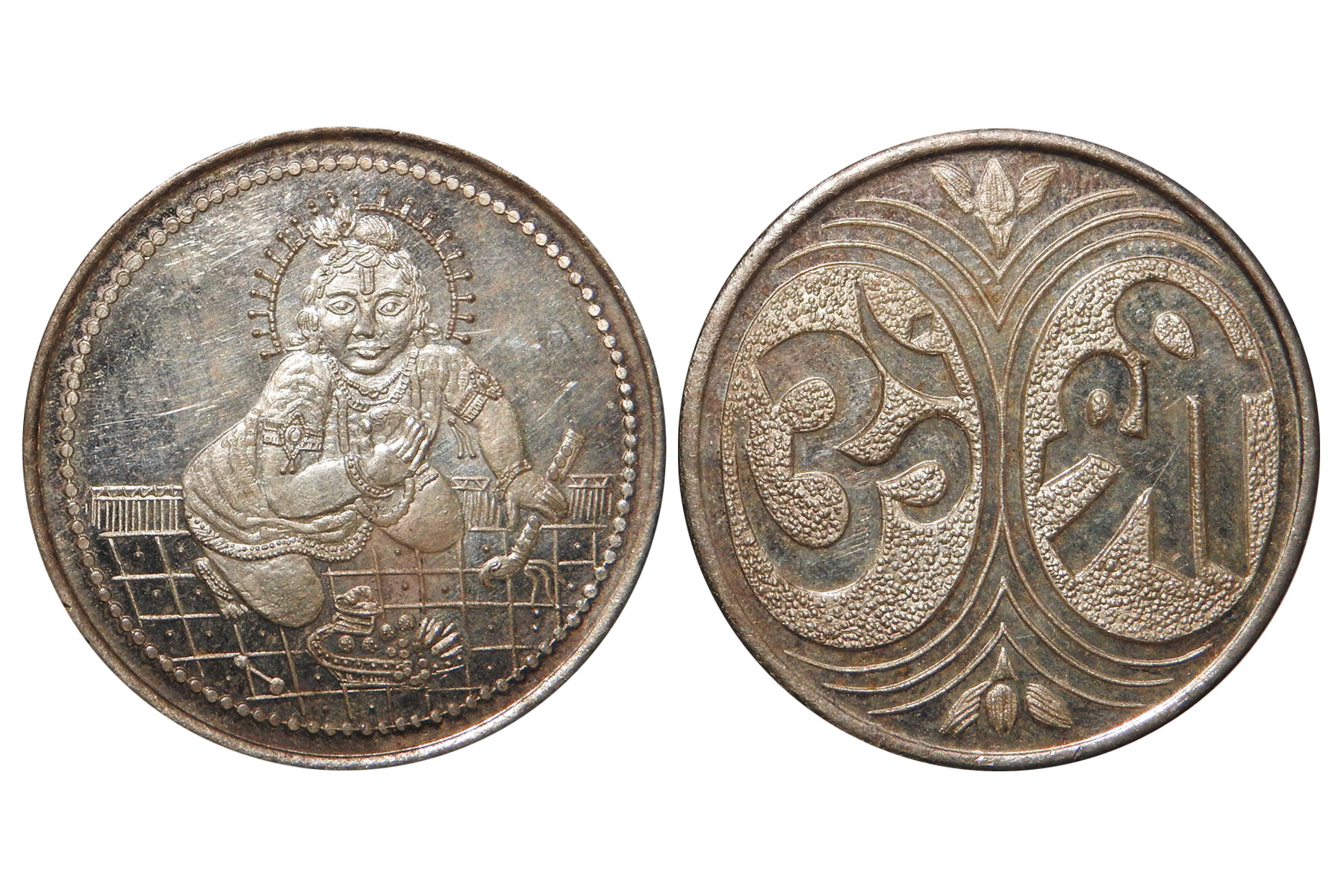 Circular silver coin, Obv. Laadu Gopal holding a flute, Rev. Om and Shri. 9.80 grams.
