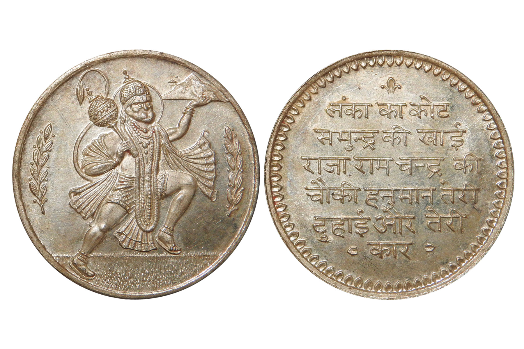 Circular silver coin, Obv. Standing figure of Hanuman lifting Dronagri Mountain, Rev. Lanka ka kot/ Samudra ki Khai/ Raja Ram Chandra ki/ Choki Hanuman Teri/ Duhahi aur Teri kar. 9.80 grams.