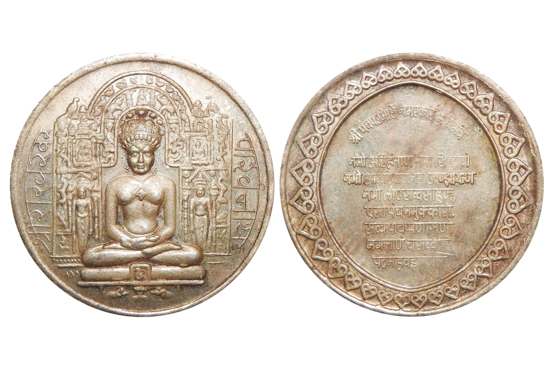 Circular silver coin, Obv. Shri Sankeshvar Parsvanatha Baghvan, Rev. Navkar Mantra. 10.0 grams.