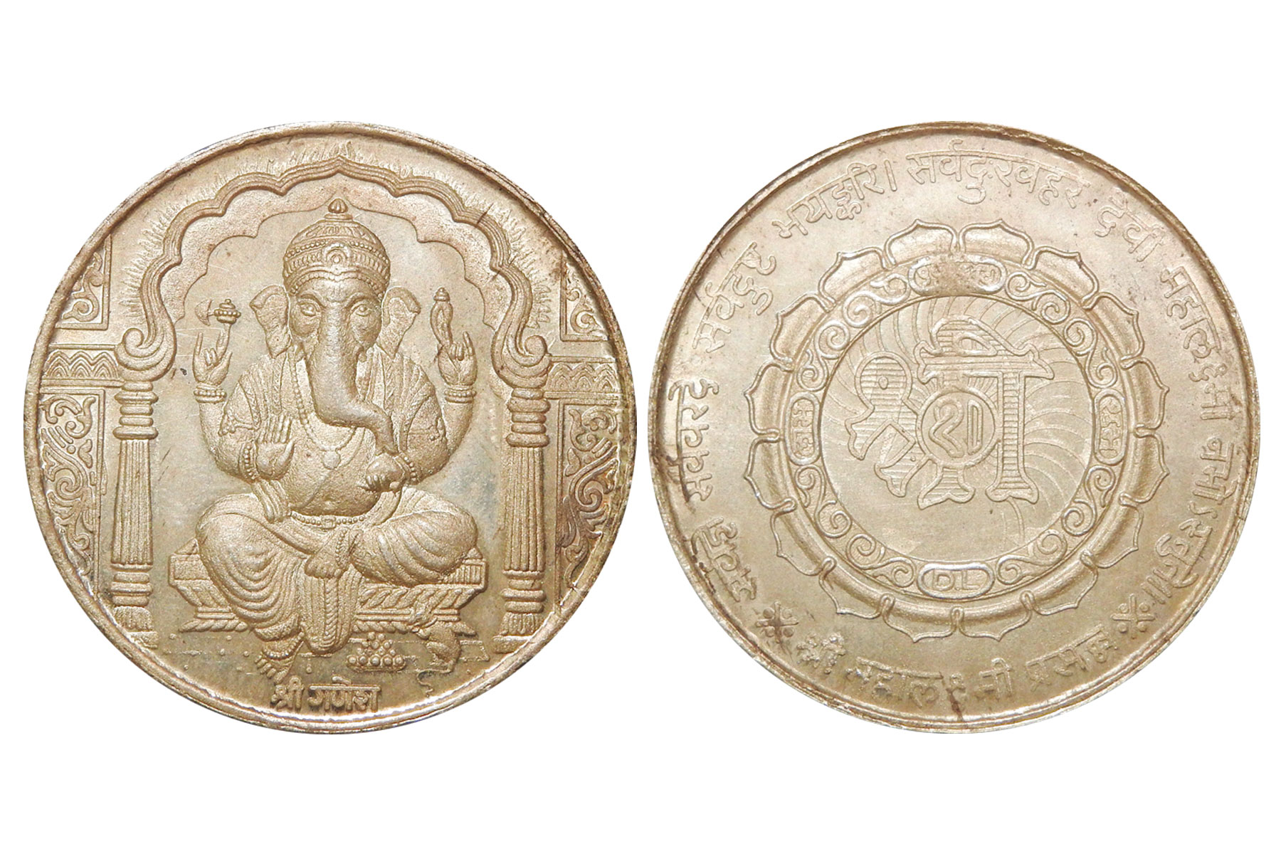 Circular silver coin, Obv. Gaja Lakshmi and Ganesha, Rev. Om and Shri. 9.70 grams.