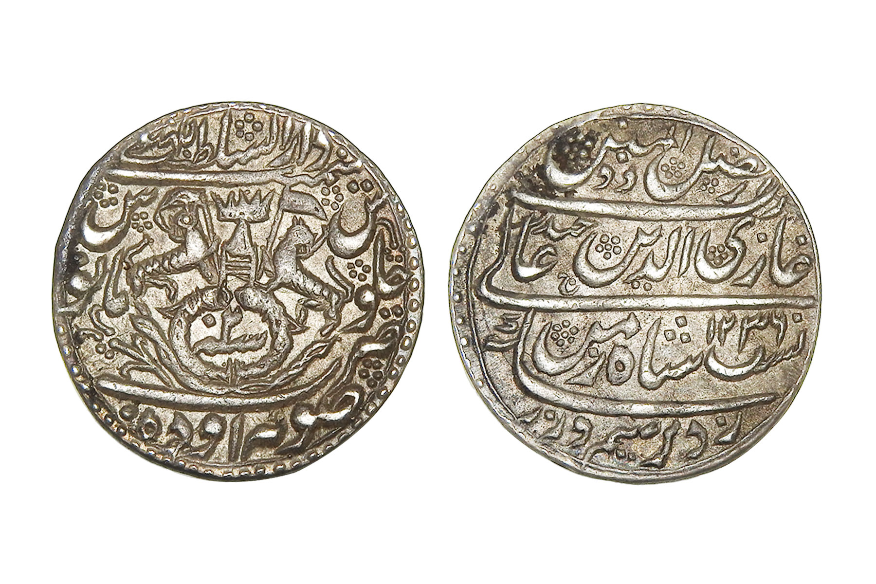 Awadh Nawabs, Asaf-ud-Daula (c. 1775–1797CE), Silver Rupee, 11.10grms, RY33, Issued in the name of Mughal King- Shah Alam II, Minted as Itawa, crude Fish and Katar as mintmark, Large Nazarana style Flan with bold legend and deep strike, Extra Fine+, Rare